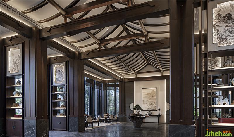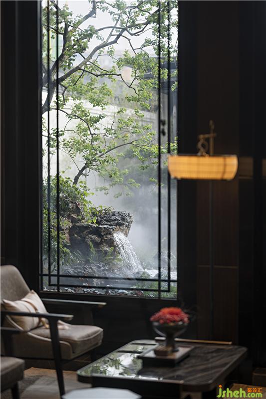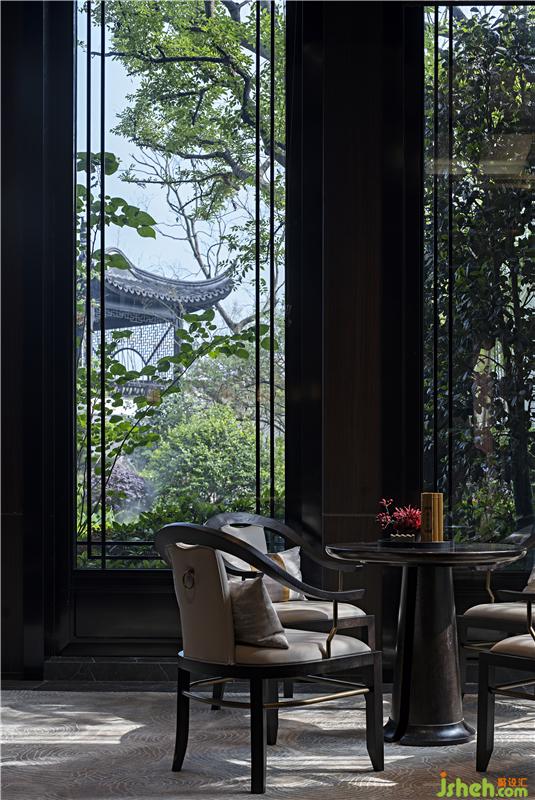 在空間的處理上,盡處造景的手法被運用到了極致,框景氤氳,呈現(xiàn)出恰如其分的藝術魅力。窗外自然景色流轉(zhuǎn)著,與室內(nèi)氣韻繾綣相融。室內(nèi)的有限空間由此得以無限延伸開來,與自然渾然一體。消弭了的空間界限,使其不受實體建筑結構的約束,室內(nèi)外生命的自由融合,正是儒門中天人合一的哲思之智的體現(xiàn)。