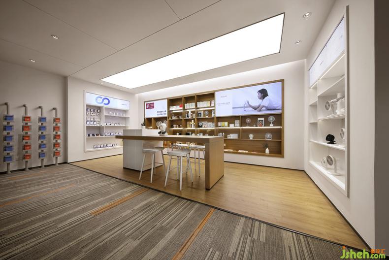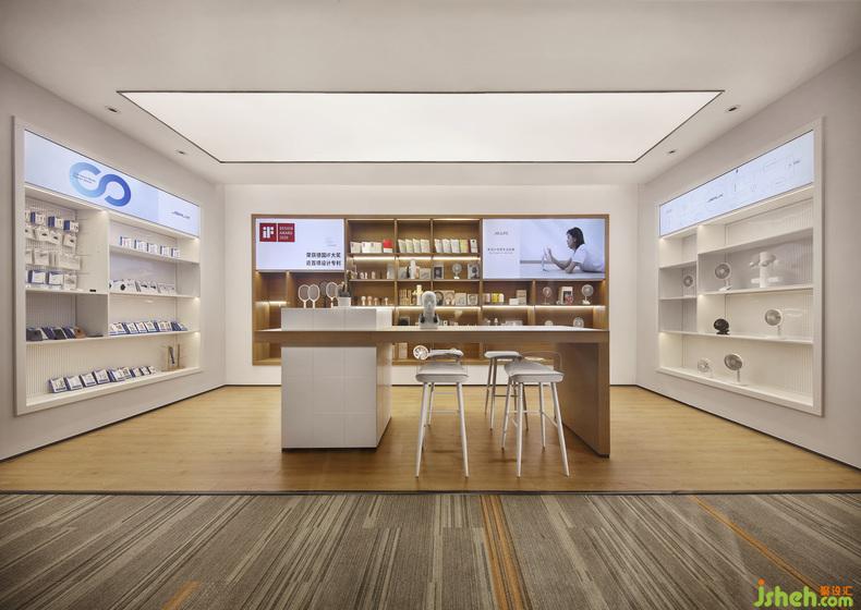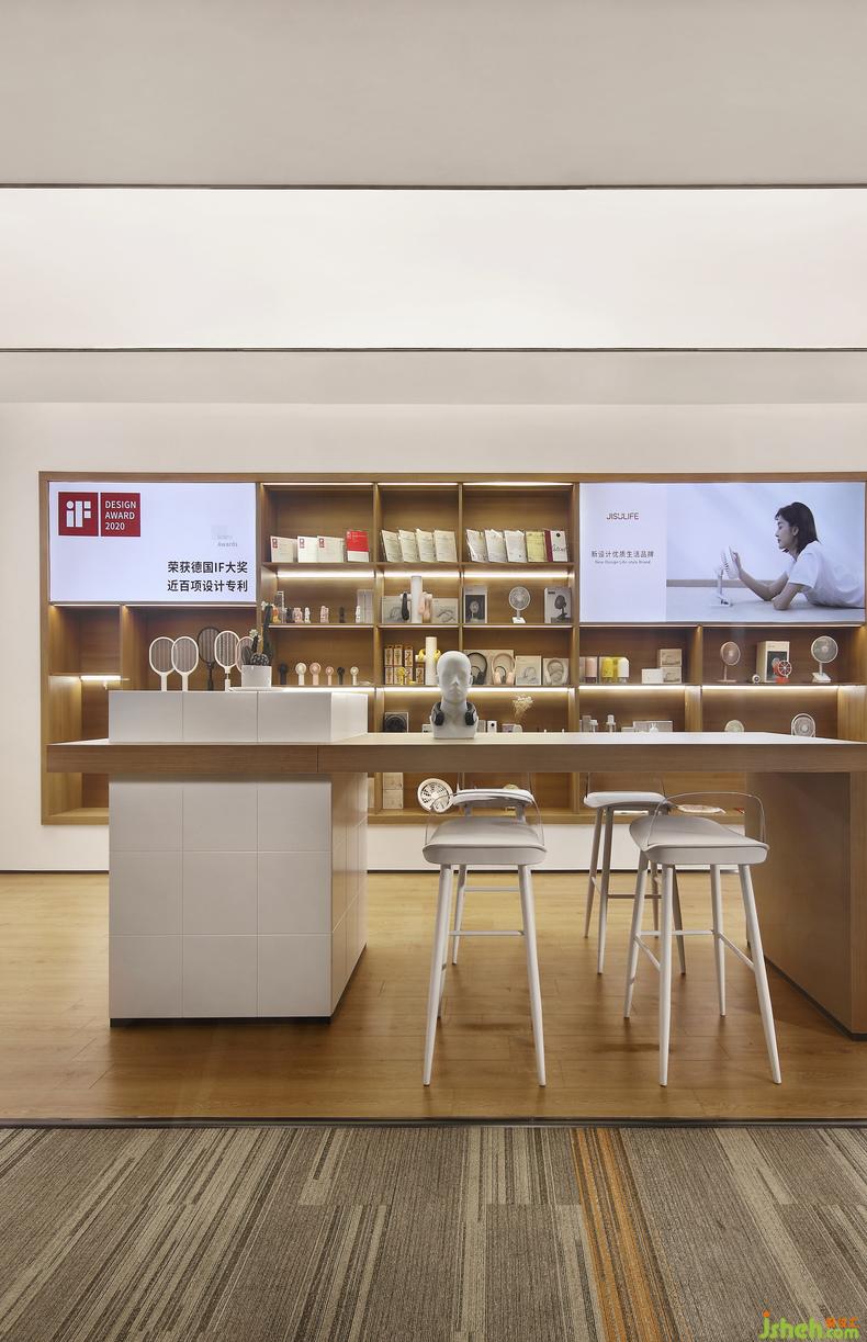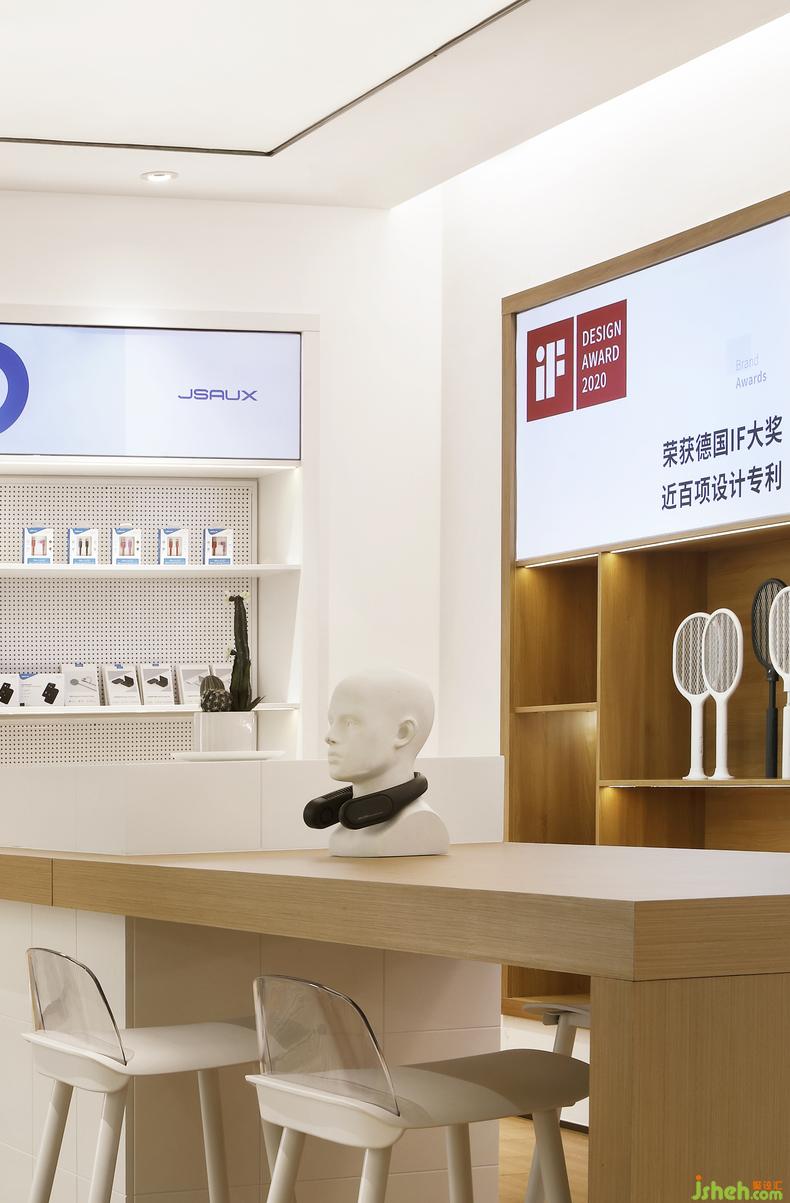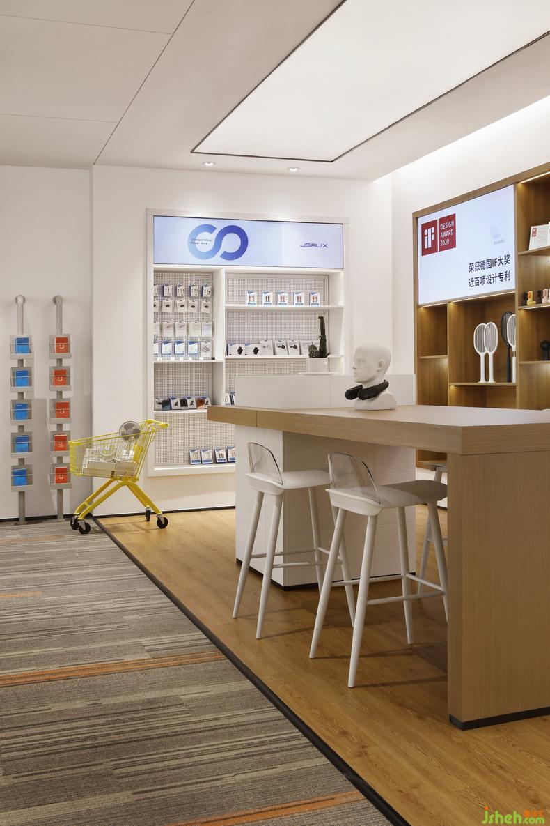 與前廳色調(diào)相呼應(yīng),品牌展示區(qū)同樣以白色鋪底,原木點(diǎn)綴,辦公室設(shè)計(jì)中間的桌面和高腳椅平添幾分時(shí)尚氣息,亦有居家書房的視覺感受