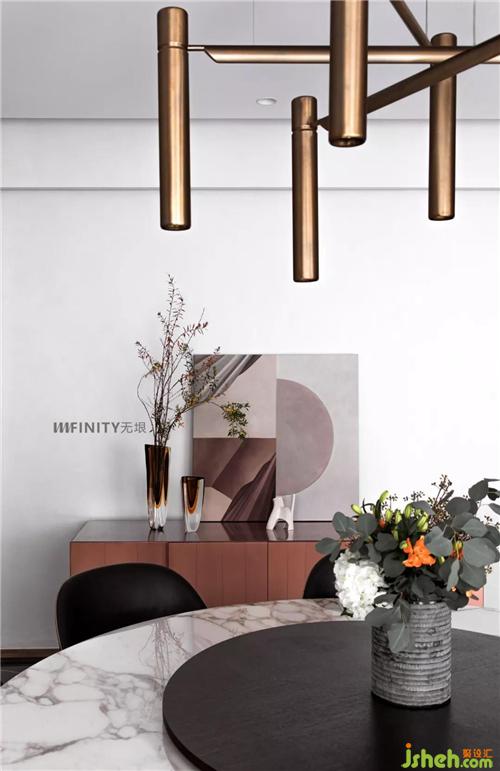 仿銅不銹鋼的屏風(fēng)柜,功能與美學(xué)并重,輕巧的區(qū)分玄關(guān)與客廳兩個(gè)空間獨(dú)立又聯(lián)系的空間層次,讓空間流動(dòng),靈動(dòng)。