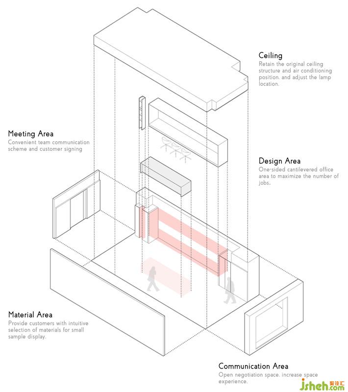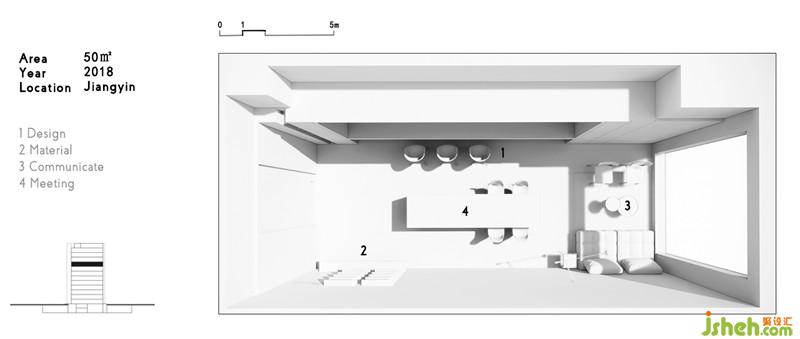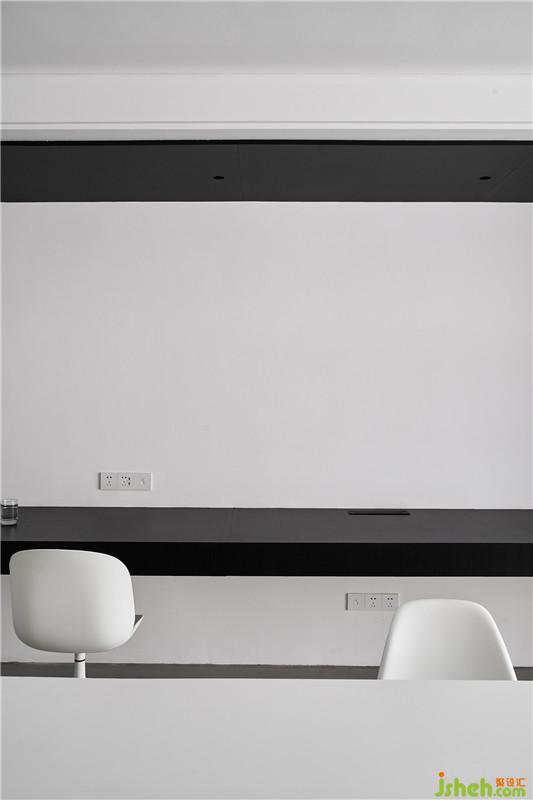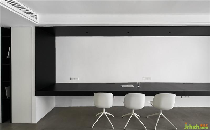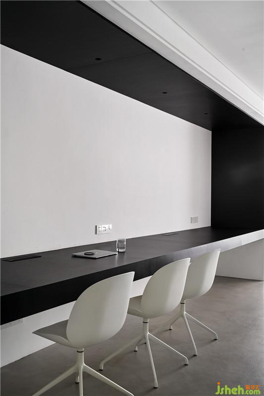 工作區(qū)域是一個(gè)盒體,黑色的體塊和白色的基面,秉持著開(kāi)放性、互動(dòng)性的原則。黑與白,具有強(qiáng)烈的視覺(jué)指引,在燈光下渲染出空間的張力。在材質(zhì)的規(guī)劃上,地面以panDOMO為基底,木皮、鋼板、乳膠漆形成界面,使整體空間融合在一起,區(qū)域與機(jī)能互動(dòng)被流暢的圍塑出來(lái)。長(zhǎng)方形格局的辦公空間,需對(duì)其不同區(qū)域機(jī)能進(jìn)行劃分,在層次上剖析、分割,進(jìn)而使功能區(qū)域間相互連結(jié),讓四周重構(gòu)我們需要的環(huán)形通道,以流暢的律動(dòng)串聯(lián)各個(gè)空間。