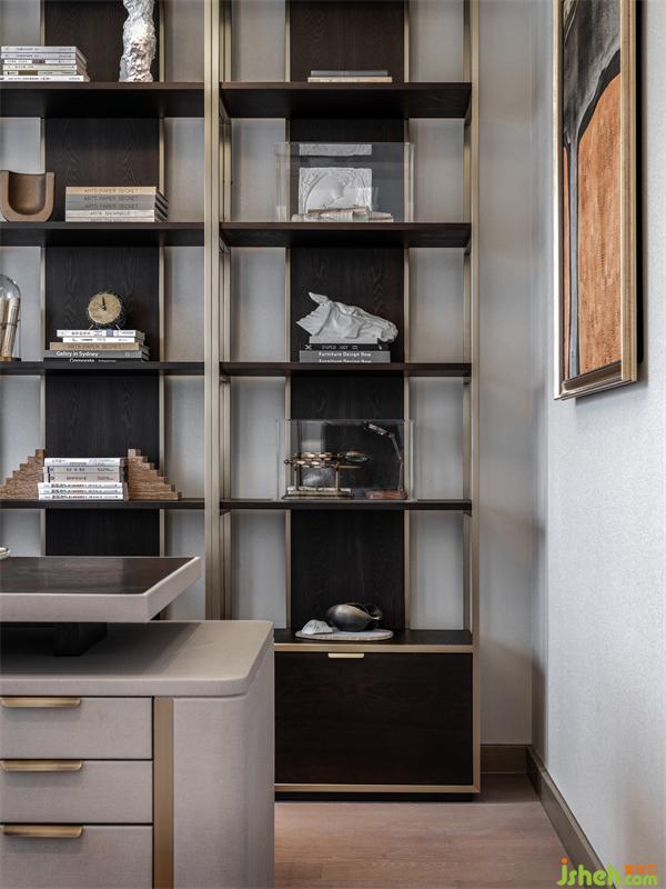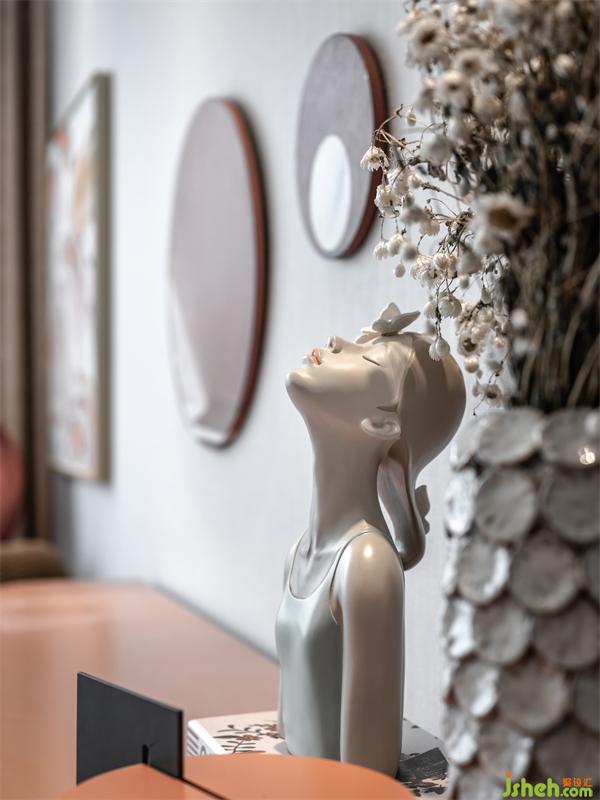 女兒房空間使用簡約內(nèi)斂的高級灰作為主色調(diào),低飽和橘色系貫穿空間,藝術(shù)品與音樂韻律的穿插,打破了空間的平淡乏味,為青春雀躍的少女時代書寫曼妙的樂章。