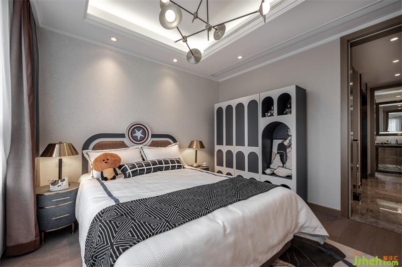 Manwei Hero主題的男孩房,樣板房設計運用紳士藍與科技白作為空間配色。圓拱造型的柜體滿足了收納與展示的雙重需求,在致敬經(jīng)典經(jīng)典與現(xiàn)代居家體驗之間完美平衡。漫威英雄的掛畫,則象征了孩童心中充滿勇氣與正義的英雄夢想。