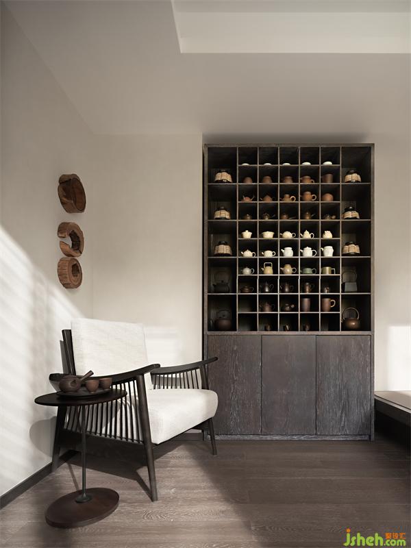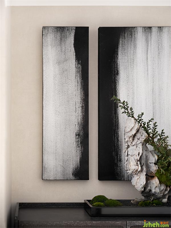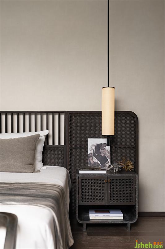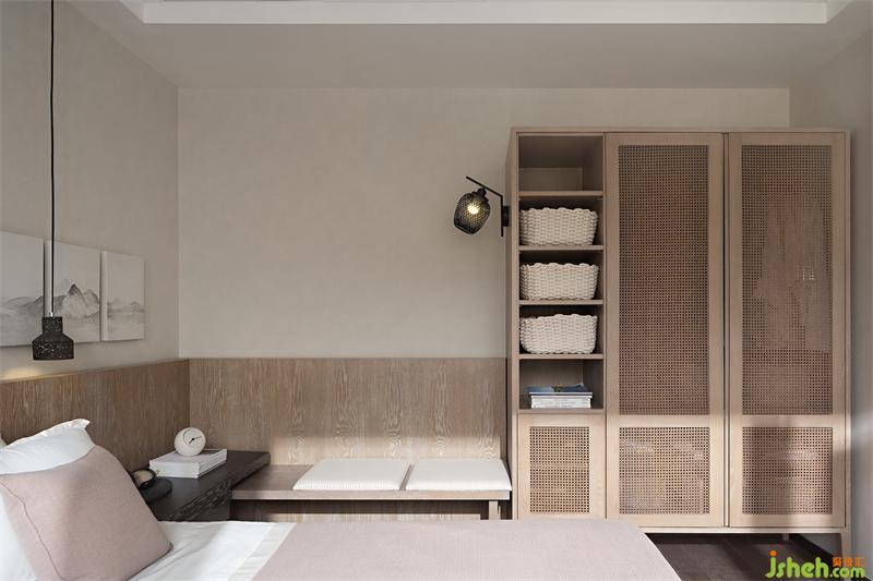 次臥床榻一體,L型邊榻與陳列柜相結(jié)合,呈現(xiàn)出一種素樸的原木感,同時(shí)配合局部的藤藝編織,柜架被賦予明式家具的靈魂,疏朗靈秀。山水畫(huà)被切割成連續(xù)感的“膠片”,蒙太奇般的在墻上打開(kāi)一扇扇“小窗”,東方的清麗素雅之美在空氣中彌漫。