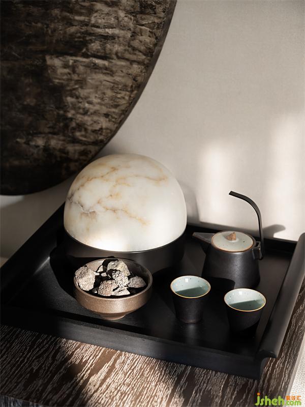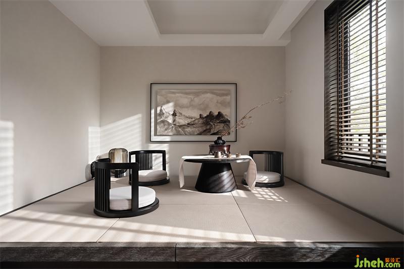 閩南愛(ài)好喝茶文化成為別墅的設(shè)計(jì)主軸,在二層,藺草席鋪就的榻榻米上圍爐夜話,山間天籟成為最好的背景音。黑白灰的無(wú)色彩設(shè)計(jì),退后成為背景,恰好為生活空間留白。