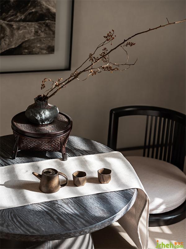 地下一層餐廚一體的樣板房設(shè)計(jì),讓生活清減中亦有豐饒。島臺(tái)與餐桌相連,煙火氣之間產(chǎn)生的每句對(duì)話,都能成為活潑的生活禪。玄色木作與天然木紋相互對(duì)話,還原了質(zhì)樸的山居氣息。