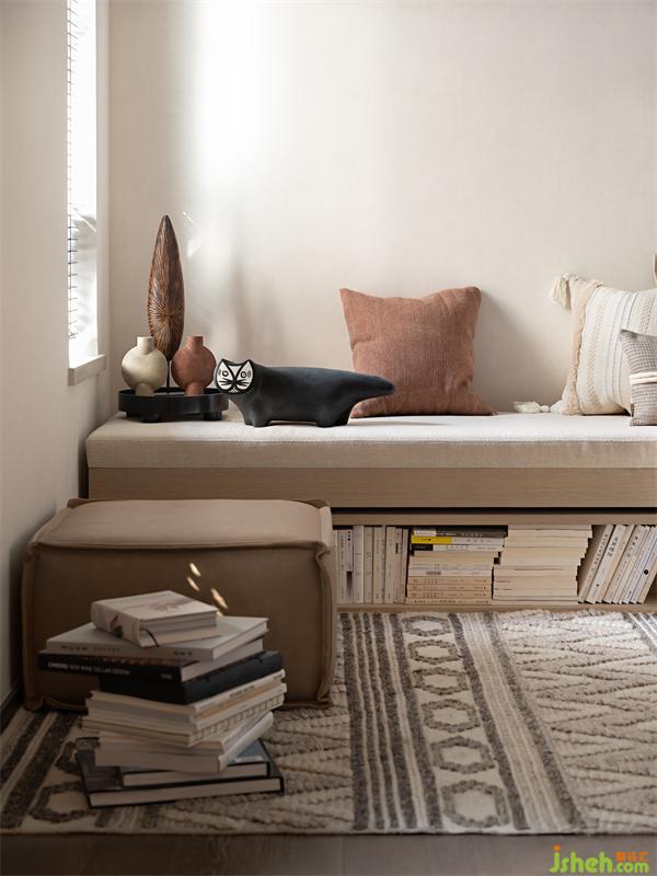 二樓的休閑空間配以臥榻兼閱讀功能,將書(shū)柜設(shè)計(jì)于床底,在此坐臥仰躺,是自由度極高的空間表現(xiàn)。