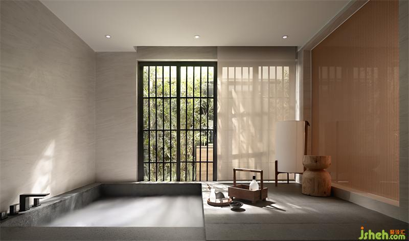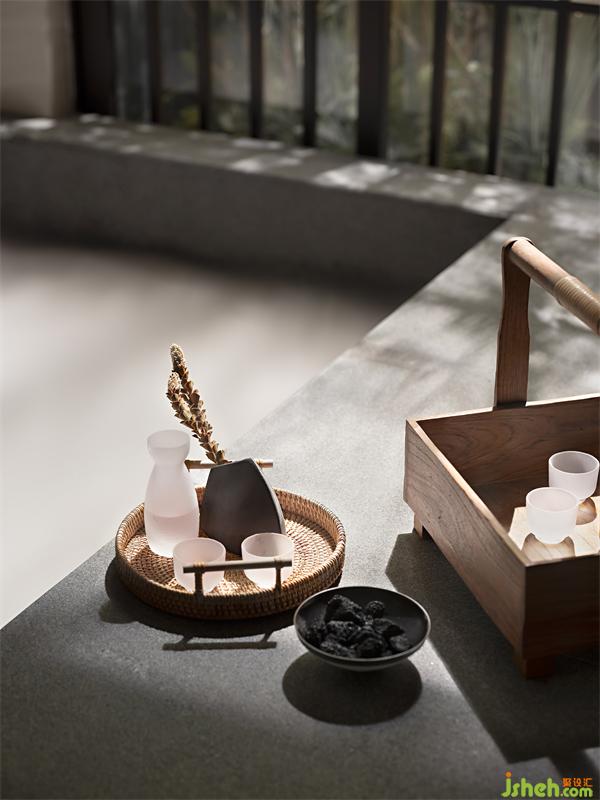 下疊餐廚空間與湯泉區(qū)緊密相連,修竹幾桿自成遮蔽的風(fēng)景。超大浴池帶來(lái)的是“溫泉水滑洗凝脂”的愜意,加之池邊提盒中梅子清酒,小酌一杯的微醺感,度假的心情隱然其中,妙不可言。