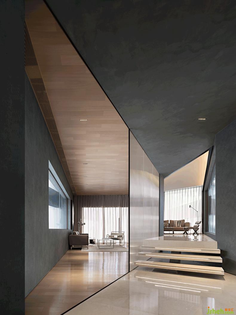 走上二樓,空間形態(tài)斜切交錯,并置了兩間VIP接待室,一間致敬經(jīng)典設(shè)計藝術(shù),另一間凸顯當(dāng)下品質(zhì)生活,以滿足多樣的功能需