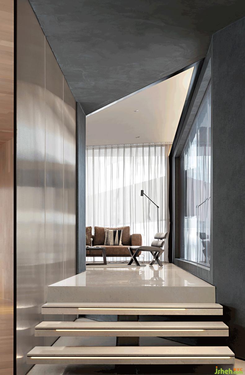 小錯層在抬高空間的過程中,也增加了人們的心里預(yù)期。懸浮樓梯的視覺質(zhì)感無比輕盈,米色石材溫馨大氣??臻g設(shè)計里有一種歐氏幾何學(xué)的智慧:異形引導(dǎo)和對稱呼應(yīng)讓人們無法不沉浸其中。