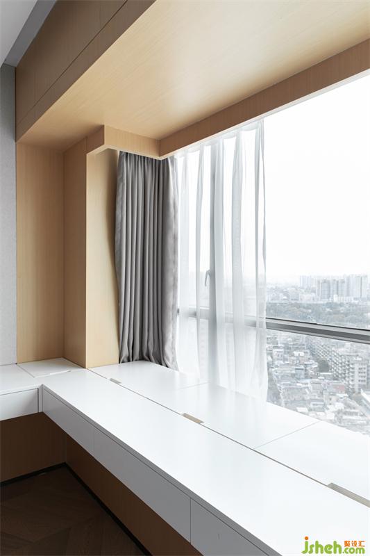 靠窗部分結合飄窗造型做成梳妝加書臺一體的桌子