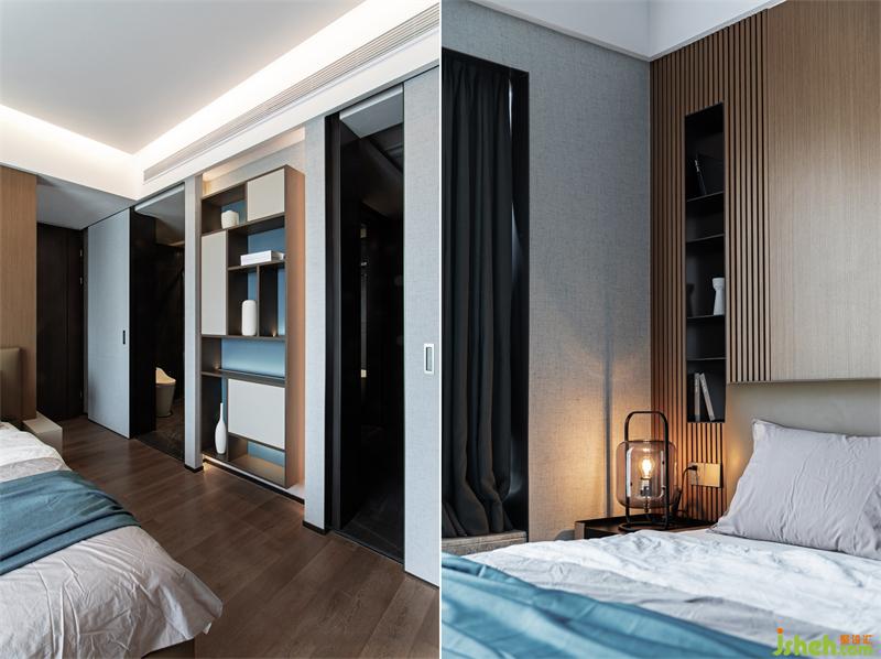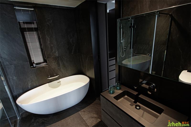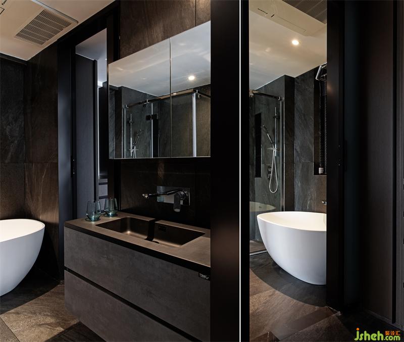 主衛(wèi)生間運用深灰色瓷磚,反襯出潔具的潔白無瑕,加上暖黃的燈光,產(chǎn)生高級感。