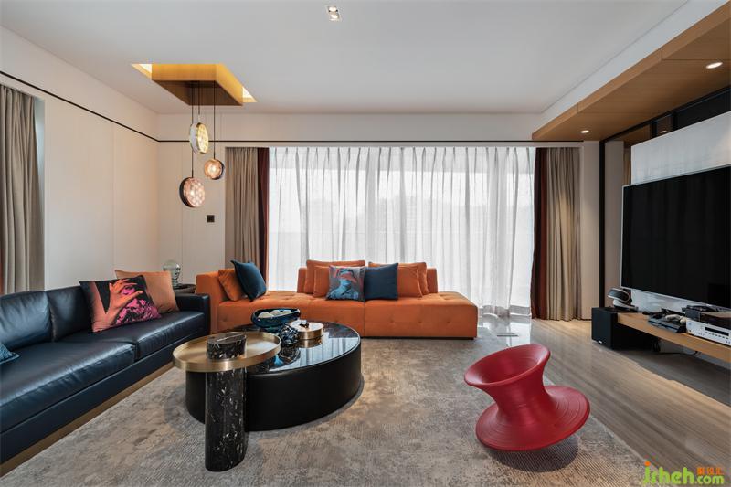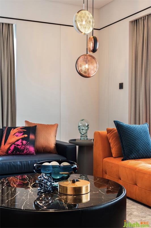 鮮橙的沙發(fā)倚窗而立,映著窗外的陽(yáng)光,張揚(yáng)著火熱的生機(jī)與力量;側(cè)邊則搭配了布魯氏藍(lán)的背靠式沙發(fā),中和的鮮橙帶來(lái)的熱鬧,空間角落瞬顯沉靜內(nèi)斂。正上方熠熠的金屬吊燈,也參與著這場(chǎng)歡快的交響演奏。