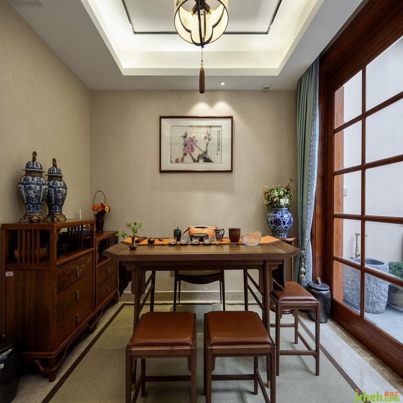 地下茶室以新中式風(fēng)格為主,中間的翹頭案是中堂文化中不可或缺的重器,傳統(tǒng)上的固定陳設(shè),給人營(yíng)造一種雅致的氛圍。翹頭案后面的圈椅,墻邊的邊柜,包括角落的木質(zhì)圓幾、陶瓷花瓶,都帶著傳統(tǒng)文化的感覺,一種書香氣息,油然而生。
