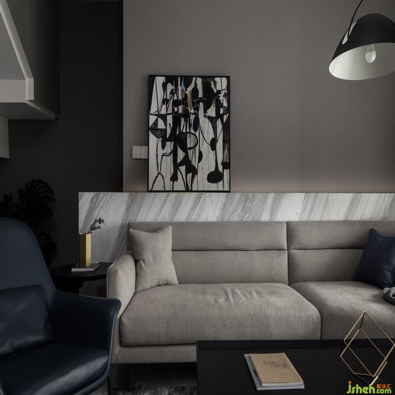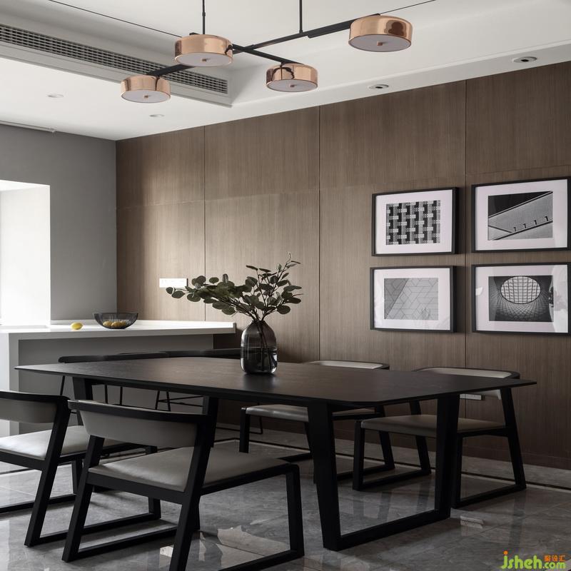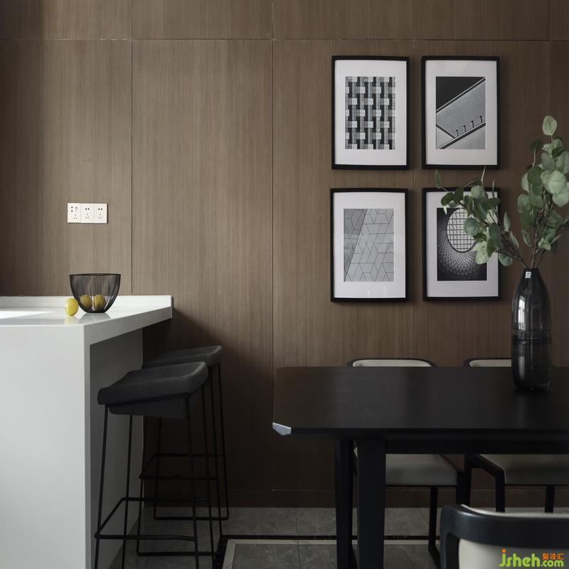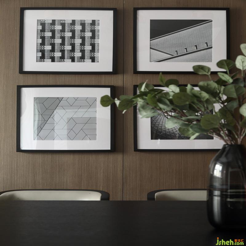 室內(nèi)設(shè)計(jì)師利用餐廳區(qū)域的木色與客廳沙發(fā)背景的灰色,一暖一冷,層次感鮮明。背景墻上的建筑裝飾畫,成為空間中獨(dú)一無二的視覺亮點(diǎn),充分體現(xiàn)一個(gè)建筑者內(nèi)心的獨(dú)白。