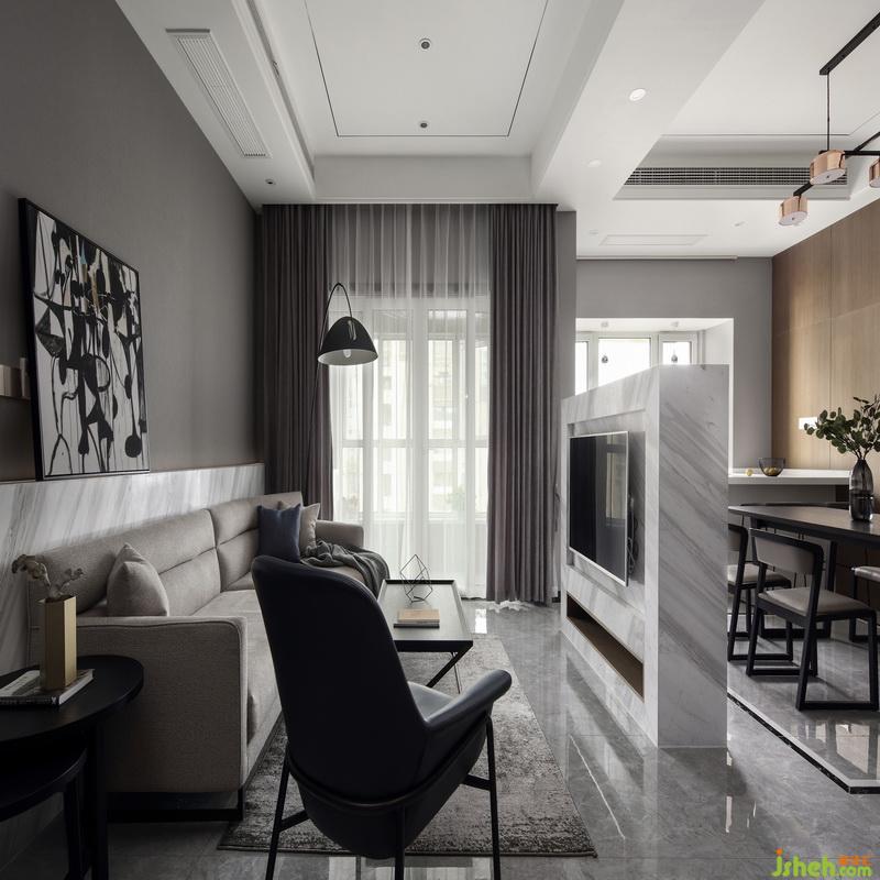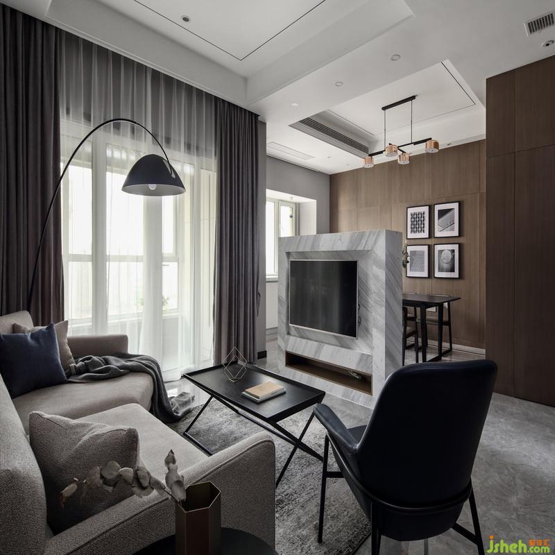 電視背景室內(nèi)設(shè)計(jì)師采用了半高墻的設(shè)計(jì),視覺開闊,室內(nèi)動(dòng)線比較靈活,也起到了劃分空間的作用。整個(gè)客廳灰白呼應(yīng),色調(diào)統(tǒng)一,個(gè)性且不失格調(diào)。