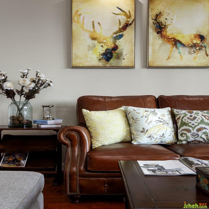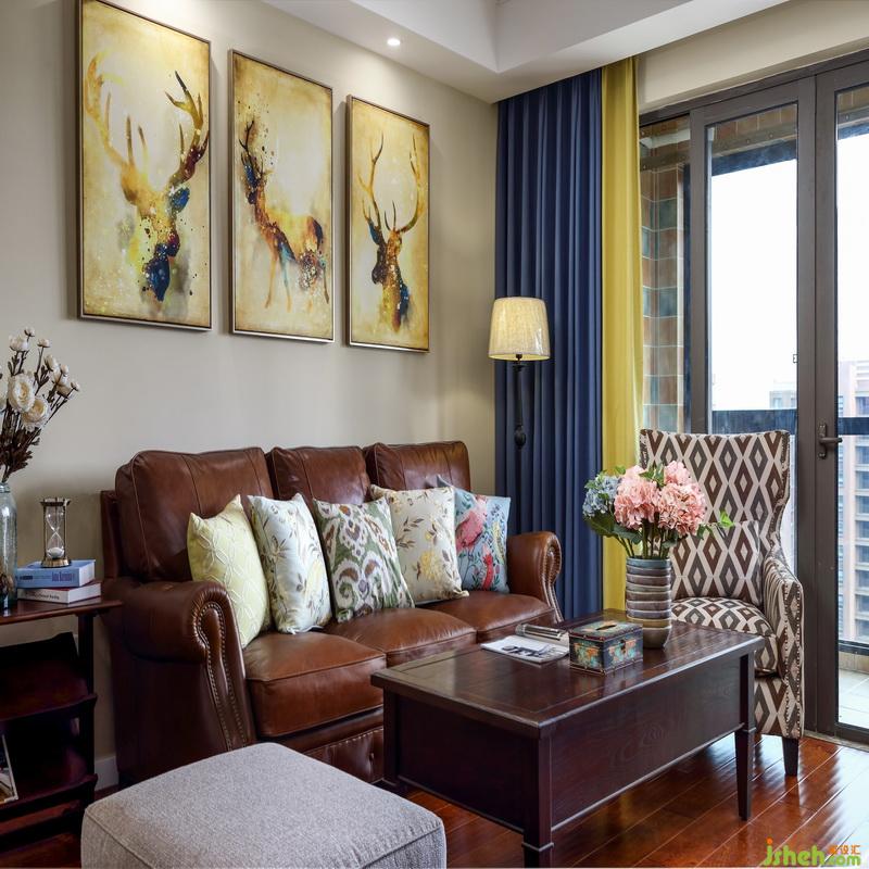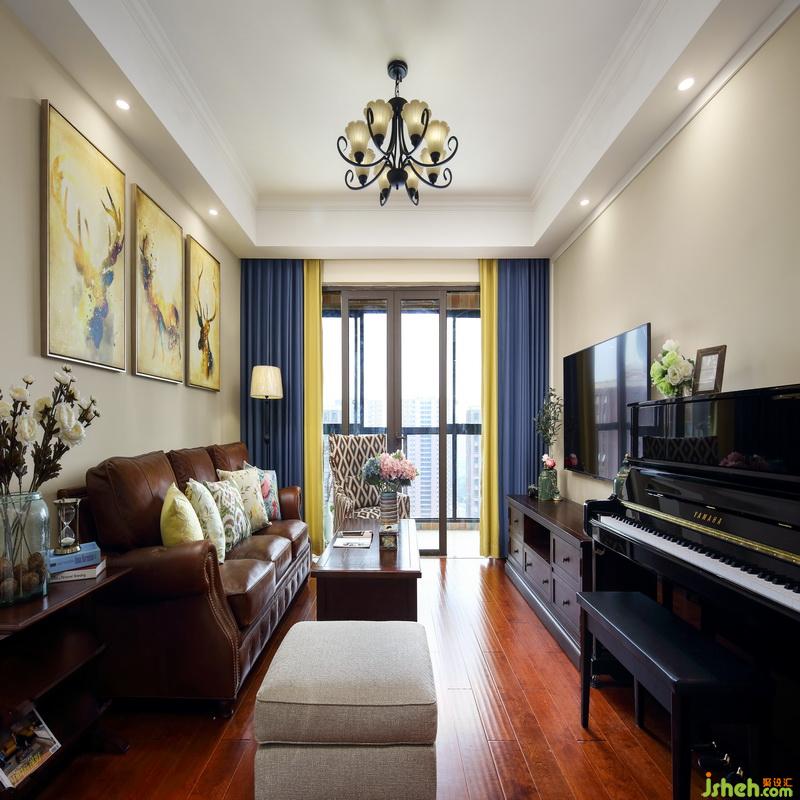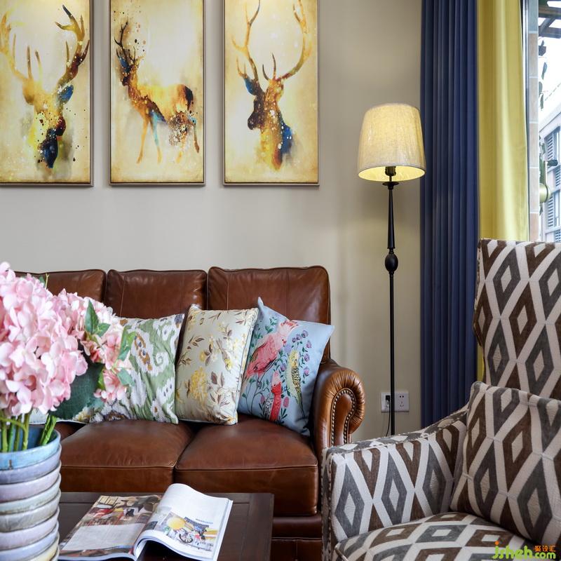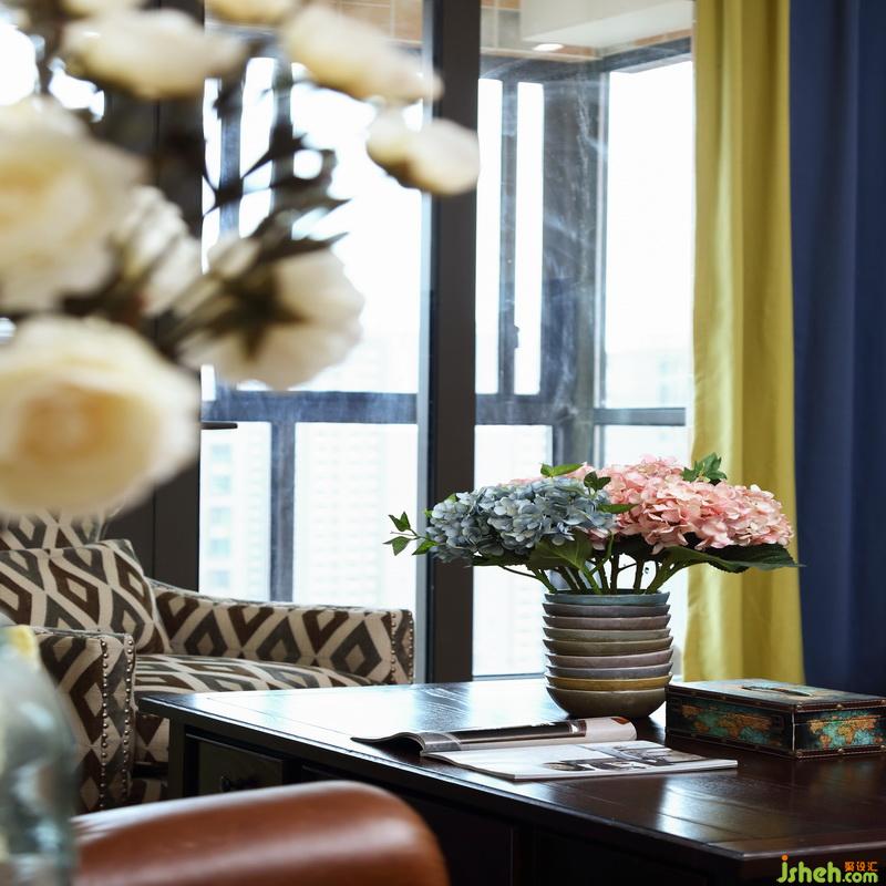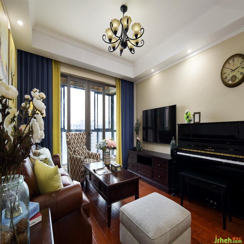 室內(nèi)設(shè)計(jì)師用藍(lán)色的沉穩(wěn)結(jié)合黃色的活潑,與整個(gè)客廳區(qū)域的家具形成對(duì)比,低飽和的兩種顏色卻并不顯得突兀