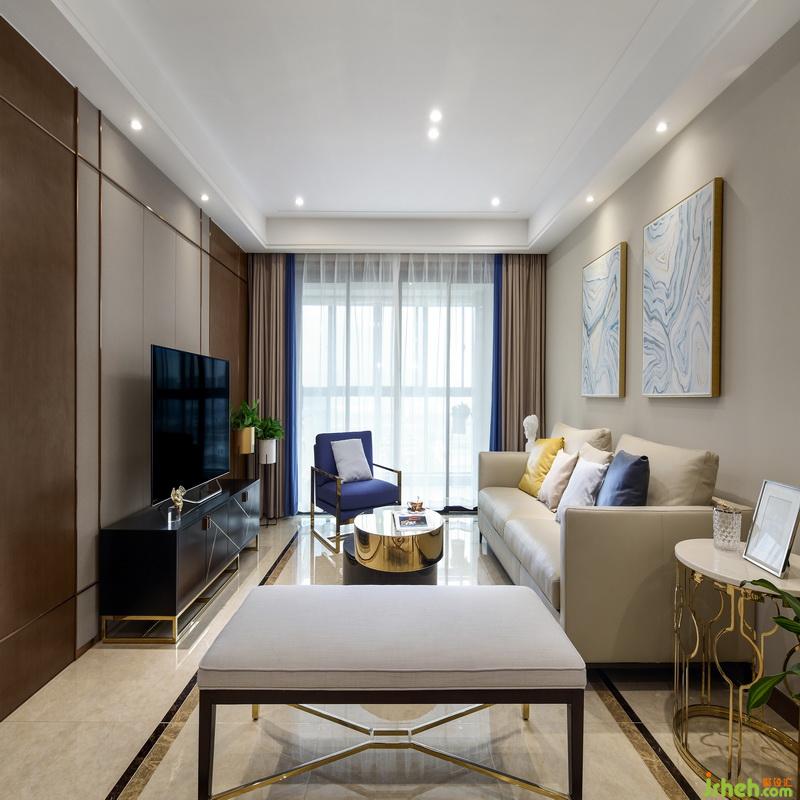 這個戶型最大的弊端在于,開發(fā)商將次臥的門開到了客廳。無論怎么改變門的位置,都會讓客廳的空間變得尷尬,室內(nèi)設計師運用了港式輕奢中最常用的金屬與木飾面結(jié)合的方式,讓門保持功能性的同時成為裝飾,讓空間更加整體。