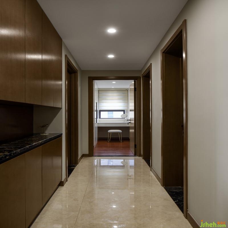 原結(jié)構(gòu)中過道上的兩個衛(wèi)生間都過小,室內(nèi)設計師將原本墻體砸掉,借出空間做出一排裝飾柜,增加儲物空間,可以放置一些裝飾品等東西。