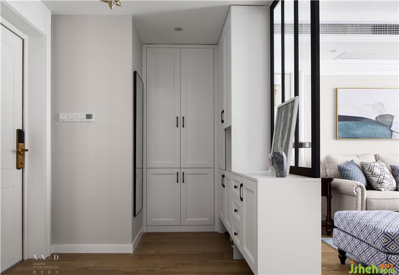 玄關(guān)室內(nèi)設(shè)計(jì)師采用將鞋柜衣帽柜做成結(jié)合模式,充分利用了拐角空間,擴(kuò)大了收納空間的同時(shí),也給出行帶來了便利。