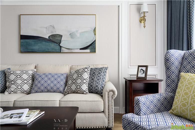 美式傳統(tǒng)的深色木質(zhì)家具,搭配柔軟舒適的沙發(fā),墻面沒有過多的顏色來喧賓奪主,反而是以淺淡的顏色為底,突出了家具質(zhì)感。沙發(fā)背景墻上的裝飾畫呼應(yīng)了整個(gè)客廳的氛圍,雅致、溫柔。
