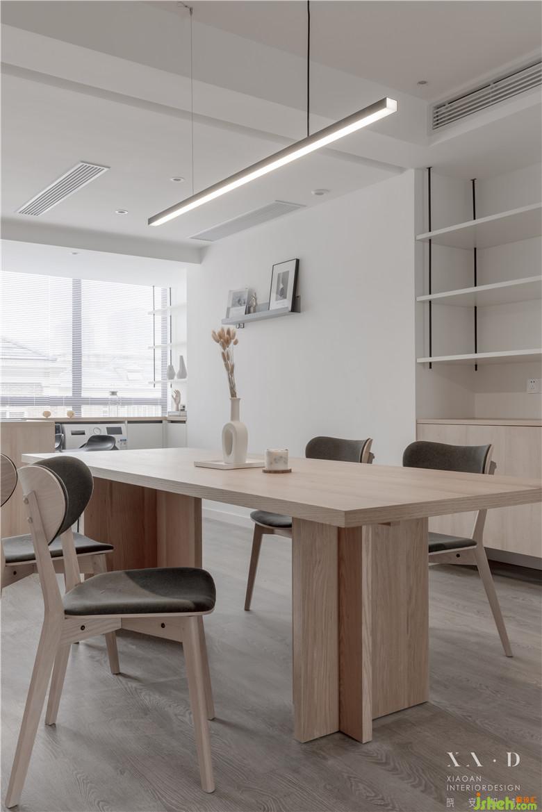 室內(nèi)設(shè)計(jì)師將一個(gè)房間舍棄做成開(kāi)放式廚房的想法跟業(yè)主不謀而合,擴(kuò)大了通風(fēng)與采光的同時(shí),也增添了更多的生活方式。這樣餐廳即使放置了2.4米的餐桌,也不會(huì)感到擁擠。(餐廳與廚房之間的頂部留有暗槽方便后期加裝移門(mén))