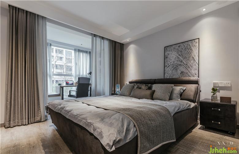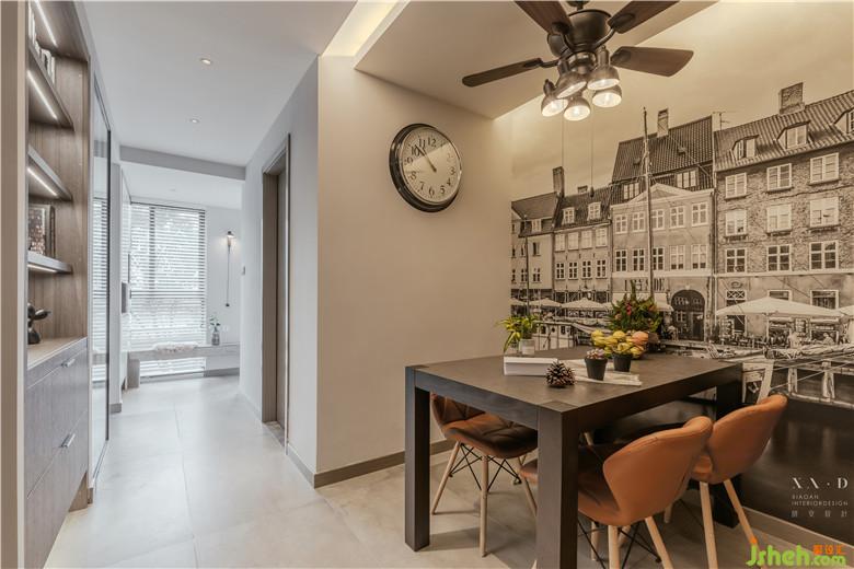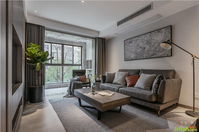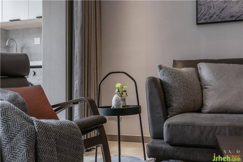 室內(nèi)設(shè)計(jì)師確保空間的平衡感,厚重的家具搭配工業(yè)風(fēng)落地?zé)?。裝飾畫搭配幾何編制的手工羊毛地毯,都被窗外的一抹綠意提亮。