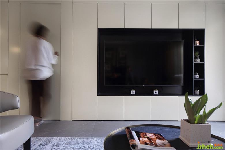 考慮到客廳空間的整體,室內(nèi)設(shè)計(jì)師將原來進(jìn)次臥室的門洞往左邊方向移動(dòng)設(shè)計(jì)成隱形門,不影響使用的同時(shí),美觀上與電視墻統(tǒng)一。