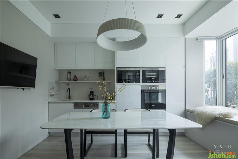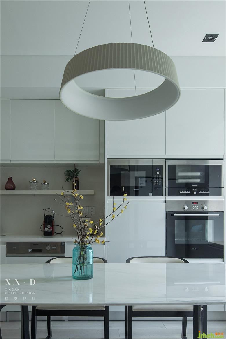 在原有空間的基礎(chǔ)上,廚房的部分做了比較大的改變。室內(nèi)設(shè)計(jì)師將原有的臥室和餐廳位置做了對(duì)掉,相對(duì)空間較大的臥室被設(shè)計(jì)成了餐廳和西廚的所在,蒸烤一類的西式料理盡可在這里完成。剛好這個(gè)空間也有一個(gè)飄窗的設(shè)計(jì),于是女主人午后的時(shí)光可以在這里悠閑度過。中式廚房躲在廊道的右手邊,大片的玻璃移門有效的滿足了廚房對(duì)于光的需求。