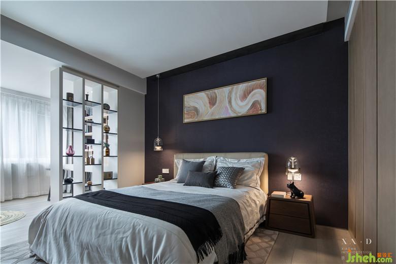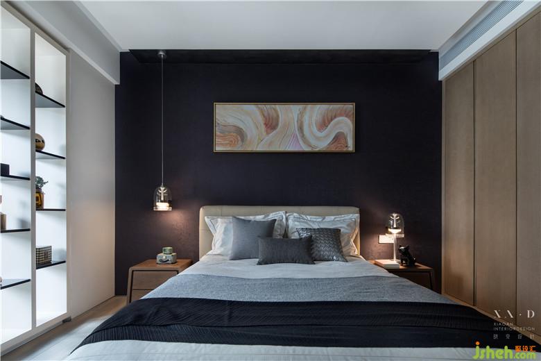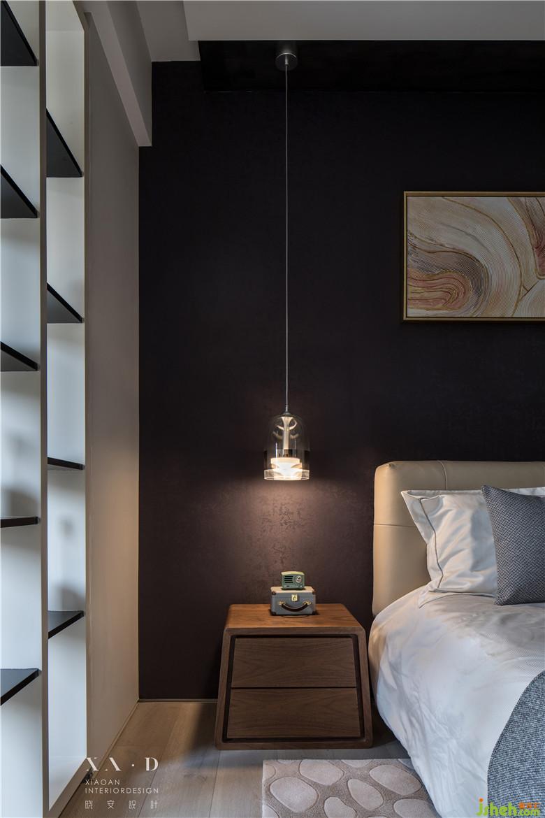 底墻室內(nèi)設(shè)計(jì)師采用了深色的壁紙,有效拉伸了空間的視覺效應(yīng)。簡(jiǎn)單的天花板和衣柜形式,突出了整體空間的簡(jiǎn)約設(shè)計(jì)風(fēng)格。