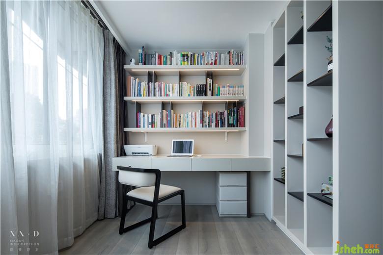 在臥室一側(cè)的書房與臥室區(qū)域隔而不斷,互不干擾。前側(cè)和右側(cè)的層架,有效的緩解了千層藏書的存放壓力。