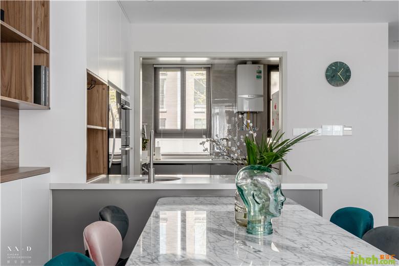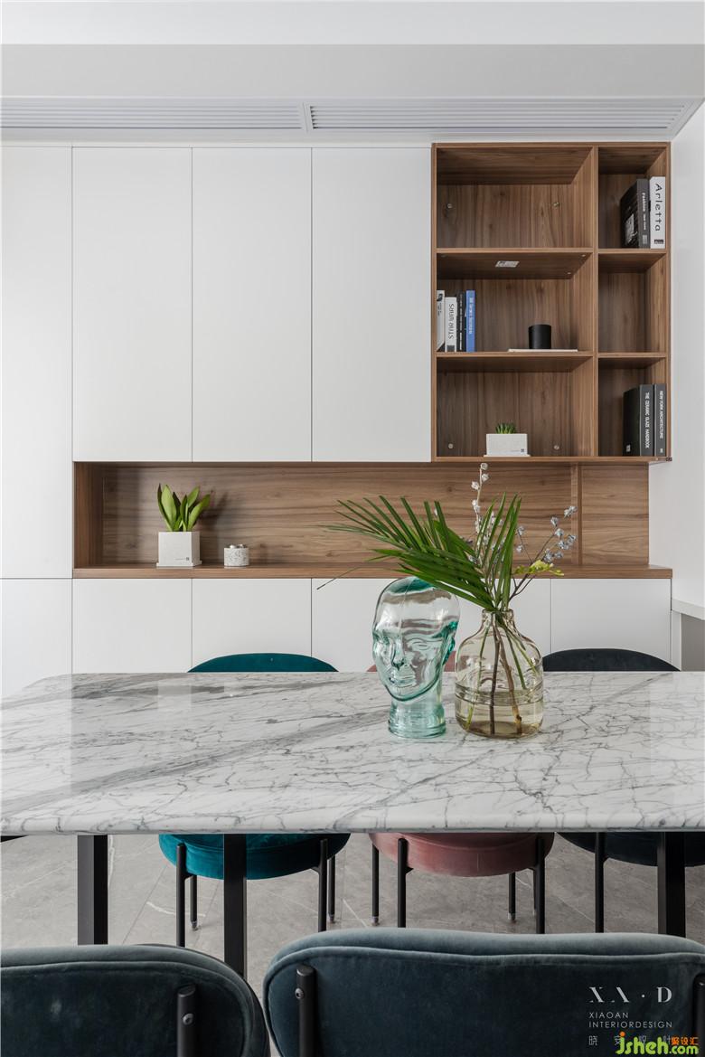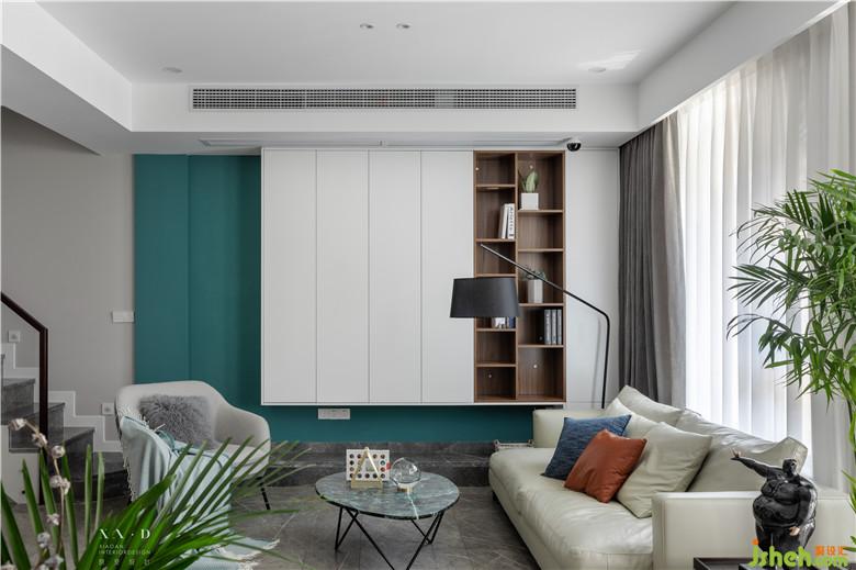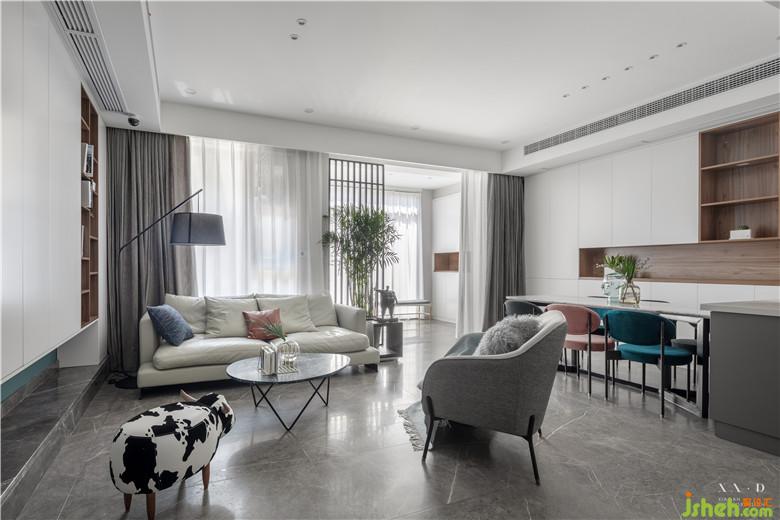 客廳空間整體色彩,明快輕松。沒有被傳統(tǒng)局限,根據(jù)家人的生活習(xí)慣,設(shè)置成平時(shí)喝茶、看書的地方。沒有大體量的家具阻隔空間,讓客廳與餐廳相連,擴(kuò)大視覺效果。