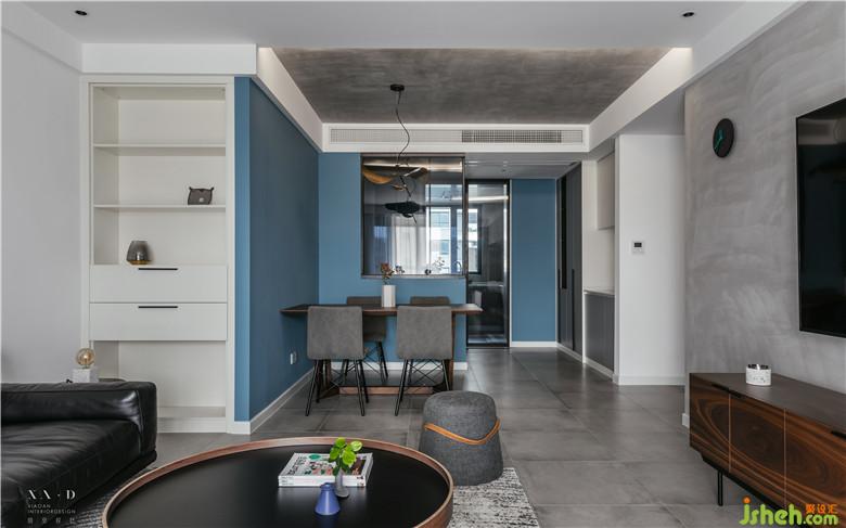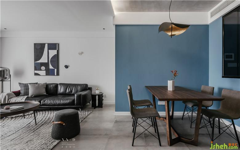 餐廳大面積的藍(lán)灰色與客廳點(diǎn)綴的藍(lán)色交融,胡桃木色的餐桌搭配藍(lán)灰色的墻面,冷暖相宜。藍(lán)灰色的靜謐與胡桃木的融合,整個空間的氣息浪漫而高級。