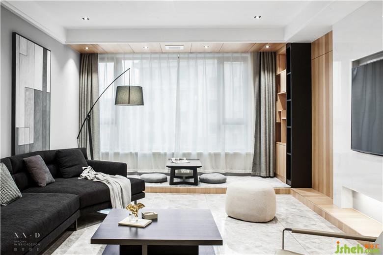 客廳的背景選用的是大理石,下面用木飾面做了地臺,由于業(yè)主喜歡喝茶,所以室內(nèi)設(shè)計師把原有的陽臺直接改成了茶室,這樣整個茶室的地臺延伸到電視墻下,用地臺把茶室和電視背景墻聯(lián)系起來。