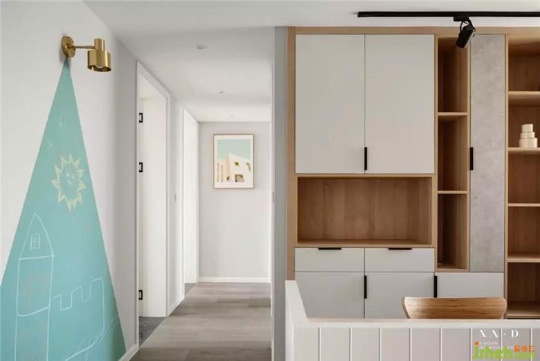 過(guò)道預(yù)留了藍(lán)色黑板漆,室內(nèi)設(shè)計(jì)師讓孩子們有一個(gè)可以盡情繪畫(huà)的地方。選擇在過(guò)道做黑板漆,因?yàn)槊鎸?duì)書(shū)房,這樣孩子和家長(zhǎng)的互動(dòng)可以相互串聯(lián)起來(lái)。過(guò)道端景的裝飾畫(huà)很好的和黑板漆的藍(lán)呼應(yīng)起來(lái),相得益彰。