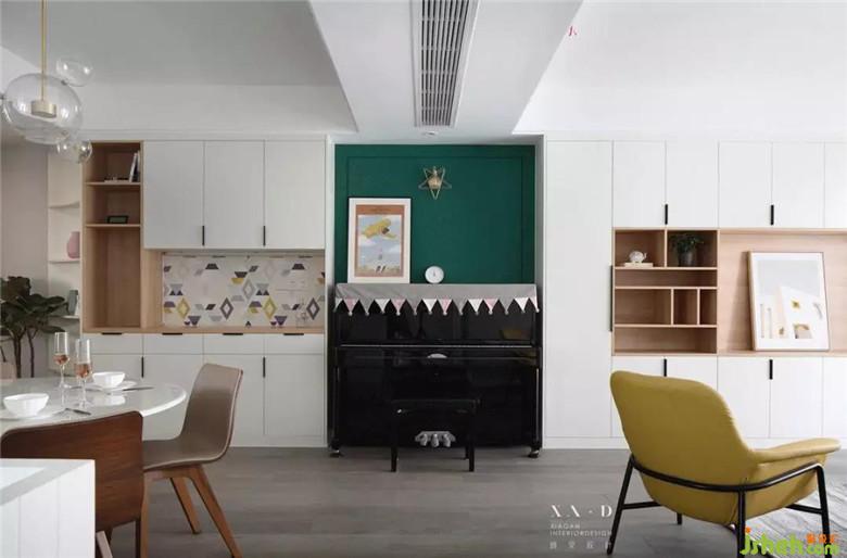 女兒的鋼琴設(shè)計(jì)在過(guò)道中間位置,客廳柜體設(shè)計(jì)中預(yù)留出來(lái)的空間放置鋼琴。墻面的顏色上選用了祖母綠色,增加空間的色彩。從單一的空間里面突顯出來(lái),既有裝飾性的效果又能讓女兒在練琴的時(shí)候不那么枯燥的面對(duì)著白墻,跳躍的顏色給人的心理會(huì)有疏導(dǎo)作用。