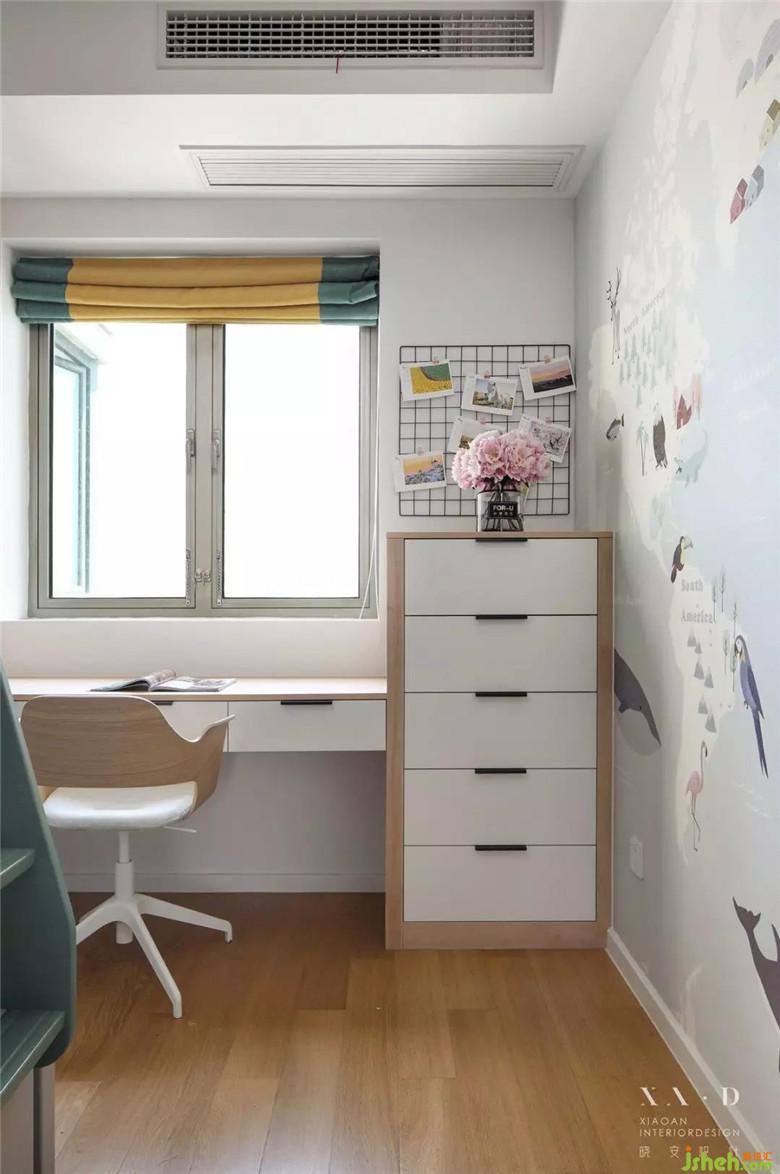 書桌面對著窗戶放置,方便以后姐姐上學(xué)書寫作業(yè)使用。墻面的卡通墻飾既可以掛東西又增添了空間的童趣,五斗柜上方的格子鐵架放置孩子們?nèi)粘5木仕查g影像,給孩子們留下一個美好的童年記憶。