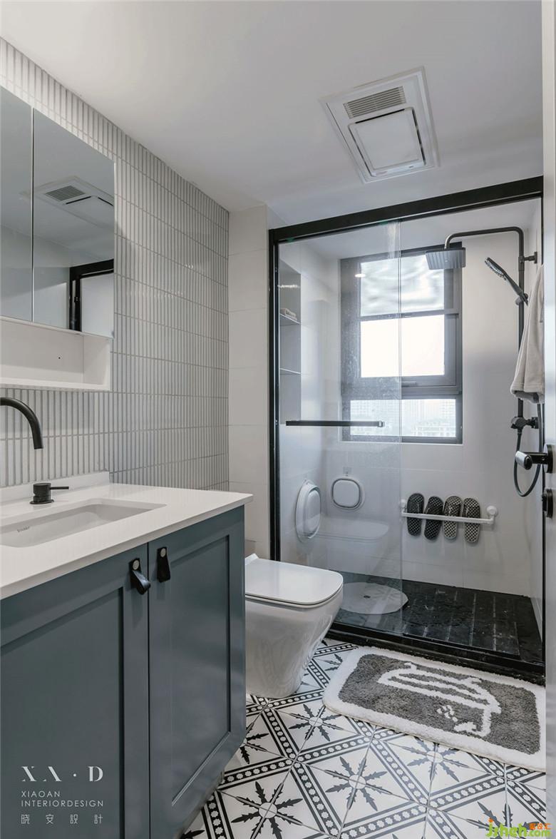 衛(wèi)浴配色清雅大方,讓人放松心神,吸水地毯、裝修公司設(shè)置置鞋架等小設(shè)計(jì)周到貼心,是生活里的小確幸。