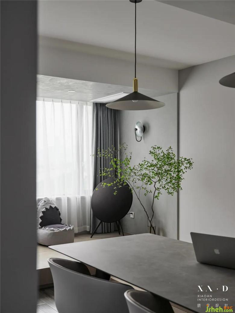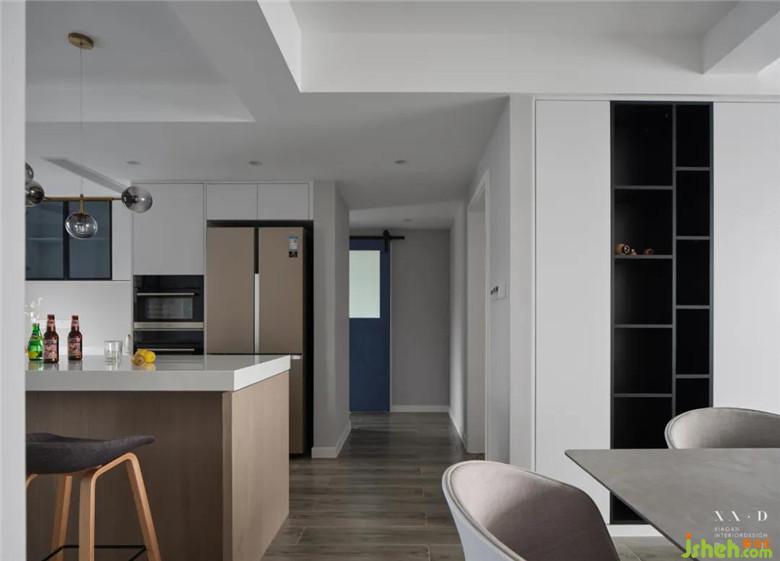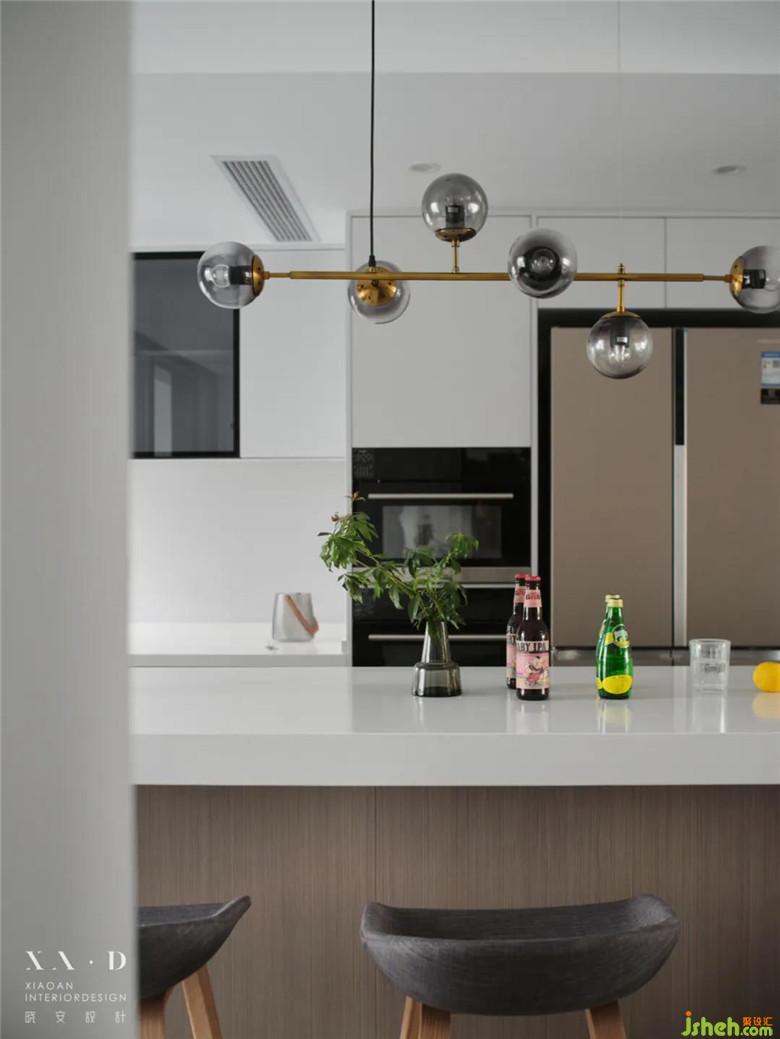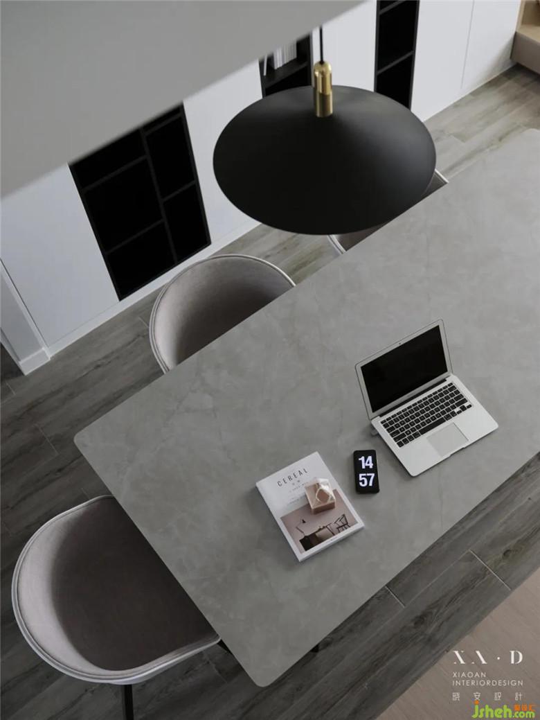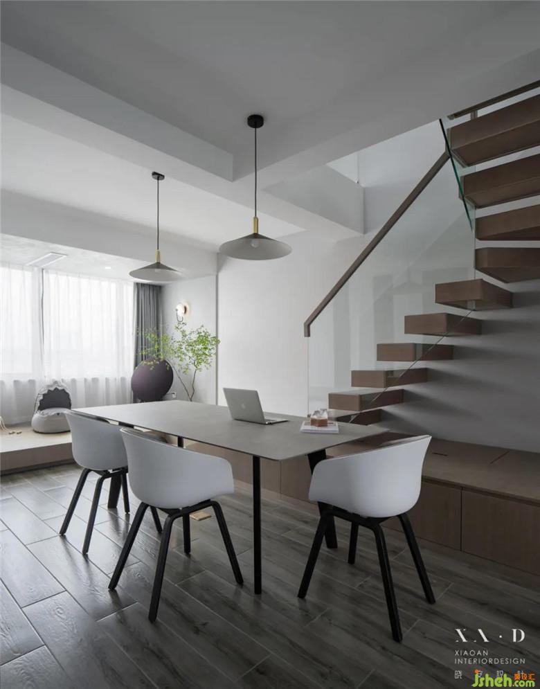 裝修公司將原有的廚房被打通后,留下的空間被改造成了西廚和餐廳。餐廳居于樓梯之下,無(wú)論從哪個(gè)方向走向餐廳,都是沒(méi)有遮擋的,動(dòng)線明確清晰。餐桌椅靠近西廚,可以免受油煙的侵?jǐn)_。