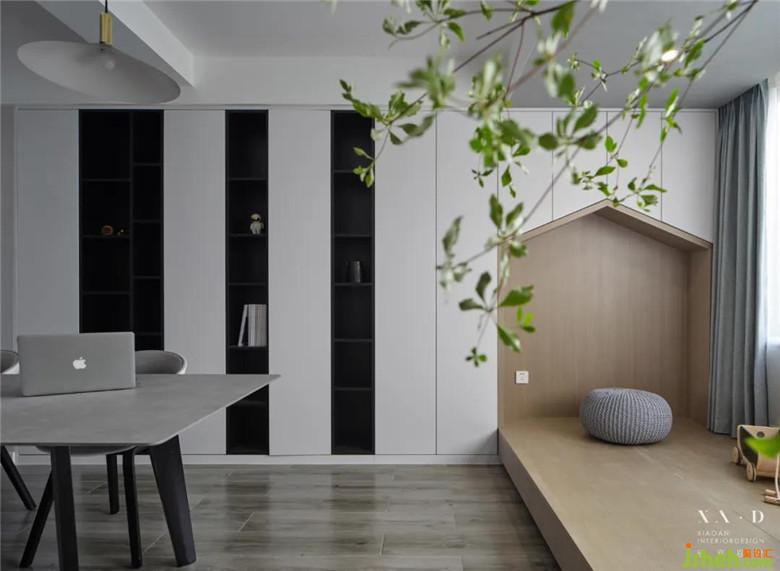 客廳是我們書(shū)香之家的精神寄托,裝修公司把傳統(tǒng)觀念里的沙發(fā)躺椅撤走后,書(shū)柜墻、大書(shū)桌成為了空間里的主角。我們夫妻倆都可以在書(shū)桌上閱讀辦公,而陽(yáng)臺(tái)則被改造成了小地臺(tái)。那是親子共讀的小天地,也是孩子玩耍的樂(lè)園。