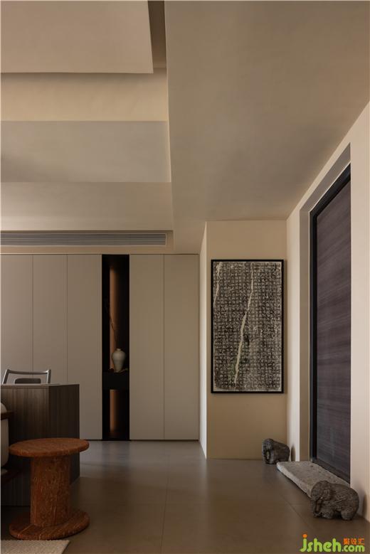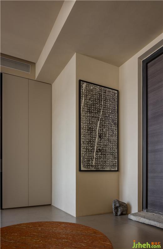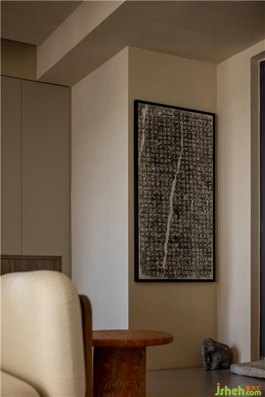 門口的東山之石、兩側(cè)的青石象、墻上的碑拓,都是男主人的收藏,運(yùn)河與岸裝修設(shè)計(jì)有的是機(jī)緣巧合下淘來的老舊物件,有的是想方設(shè)法才覓得的心頭好,第一眼看到它們就覺得很有眼緣,這些合乎心意、情有獨(dú)鐘的物品,構(gòu)成了獨(dú)一無二的玄關(guān)。