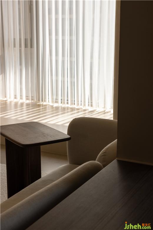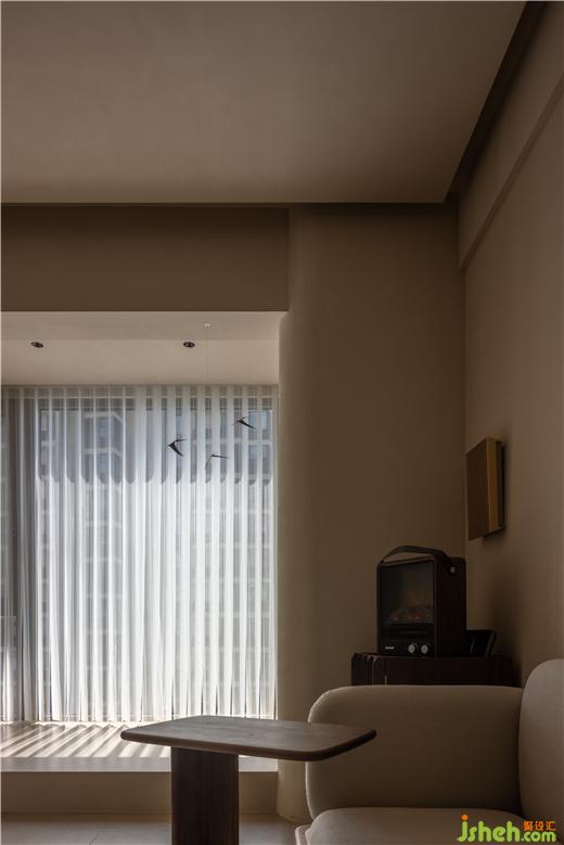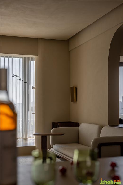 運(yùn)河與岸裝修設(shè)計(jì)以編織紋理模擬水流波動(dòng)的情景,運(yùn)用以深賦淺的藝術(shù)筆法,增強(qiáng)客廳的明朗感。胡桃木色糅合框架結(jié)構(gòu),展開布局的敘事美感,以小巧邊幾補(bǔ)充客廳的功能性,同時(shí)擴(kuò)張了開闊的活動(dòng)空間。