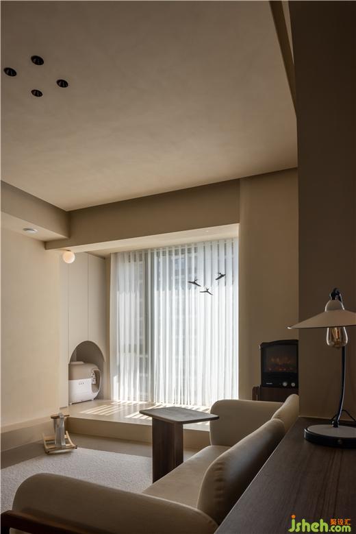 地臺(tái)向電視背景蔓延,實(shí)現(xiàn)呼應(yīng)的節(jié)奏與秩序,勾勒拱形建造貓咪私屬空間,模糊人與寵物生活的邊界。運(yùn)河與岸裝修設(shè)計(jì)以球形壁燈“召喚”飛鳥裝飾,縈繞出悠遠(yuǎn)輕靈的空間意境。