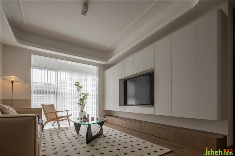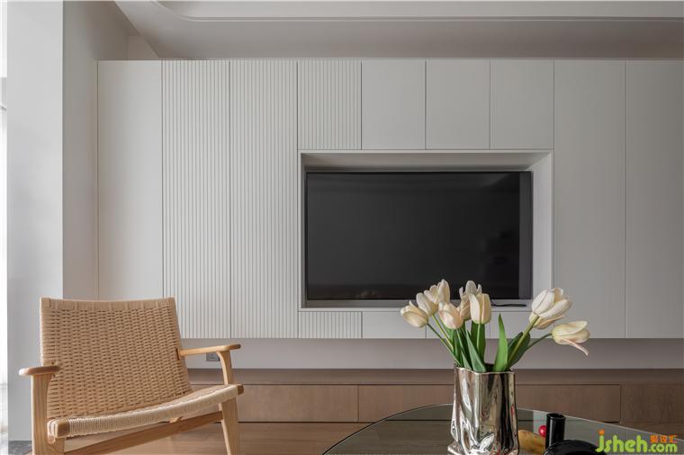 上下鏤空的電視背景與左側(cè)不對(duì)稱(chēng)設(shè)計(jì)的豎紋,在視覺(jué)上拉伸空間。平靜舒緩的白色,美的云筑家裝設(shè)計(jì)讓客廳顯得更整潔且具有呼吸感。地板、原木柜、休閑單椅都保持著材質(zhì)本身的色澤,呼應(yīng)了空間整體的調(diào)性。