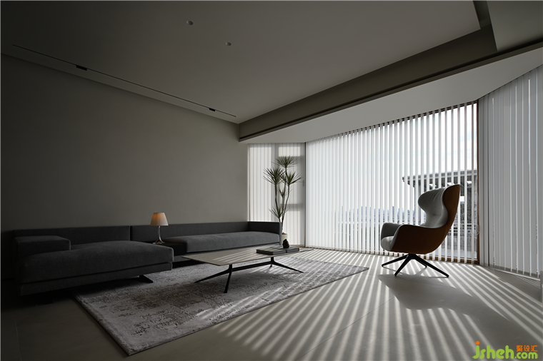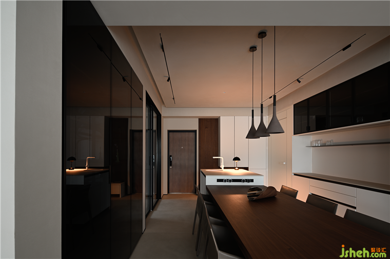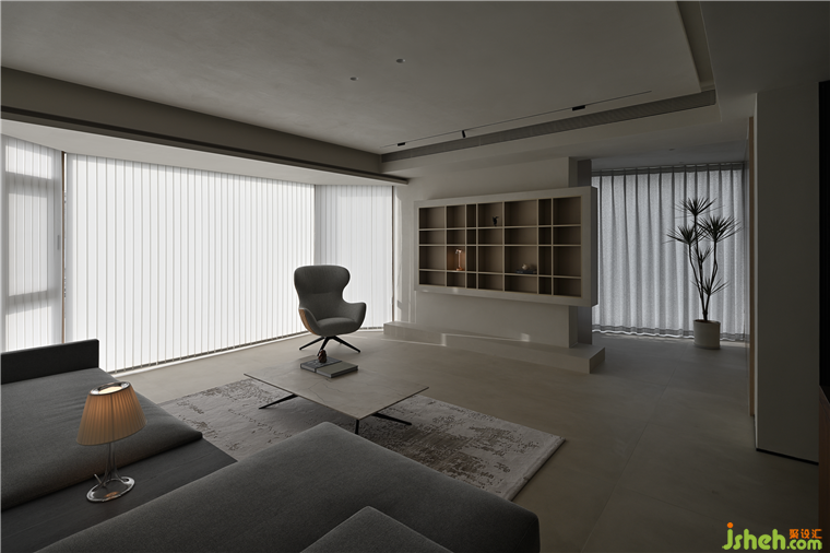 非對(duì)稱(chēng)布局聯(lián)合解構(gòu)手法,演繹共生的美學(xué),師惠花苑裝修設(shè)計(jì)鋼板懸挑柜寬窄有度,錯(cuò)落呼應(yīng),明暗對(duì)比,烘托意境。