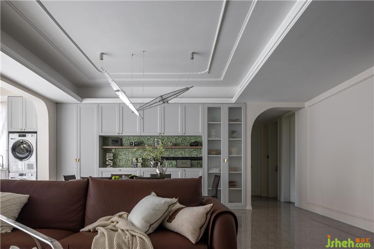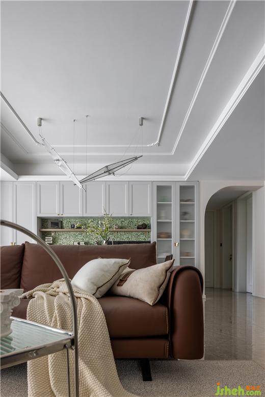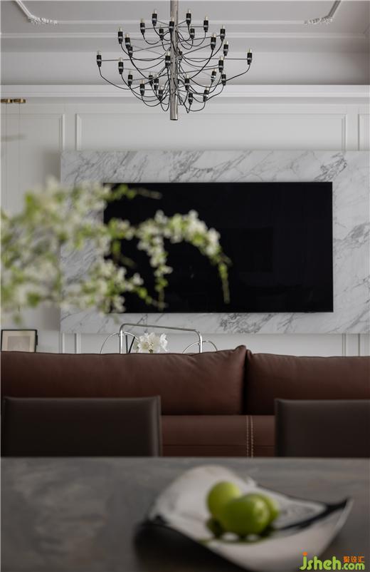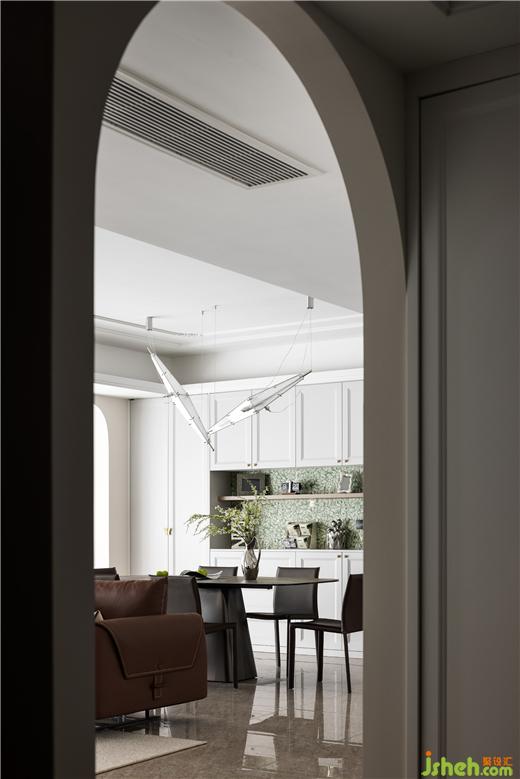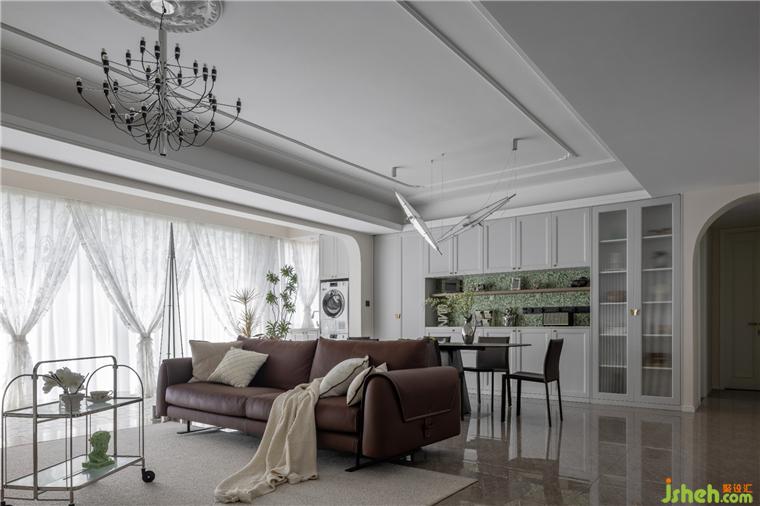 客餐廳空間大部分采用對稱結(jié)構(gòu),同時(shí)保留了法式風(fēng)格偏愛的流線造型,整體感覺非常優(yōu)雅。天鵝港豪宅設(shè)計(jì)在視覺感知上白色是比較柔和干凈的色調(diào),客餐廳以白色為主,搭配沙發(fā)的棕色,表達(dá)了別具一格的溫柔與優(yōu)雅。