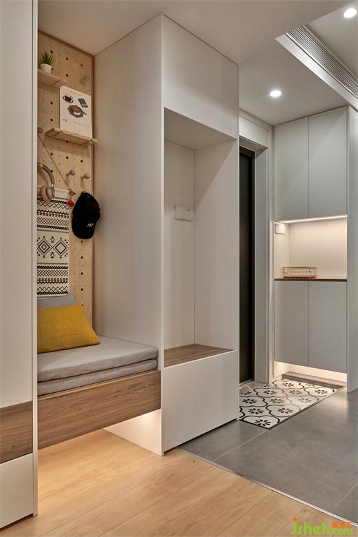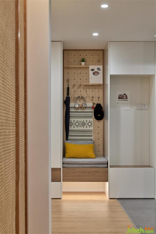 玄關(guān)采用的純白底色,隨著型體的轉(zhuǎn)折和光影的流動,闡述了溫柔而靜逸的空間氛圍。裝修設(shè)計將業(yè)主期待已久的洞洞墻布置于恰當位置,借由溫潤的木感,承載靈活的掛置功能。那一抹姜黃促使情感升溫,地面和墻面相互呼應,觀之舒適,心中歡愉。