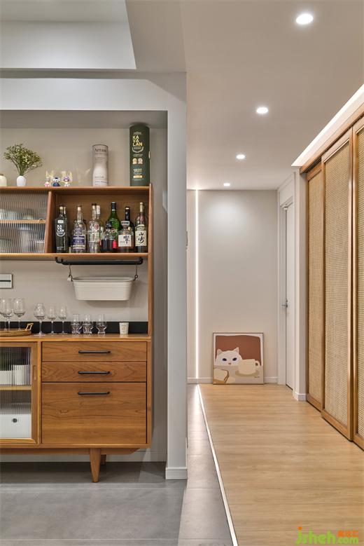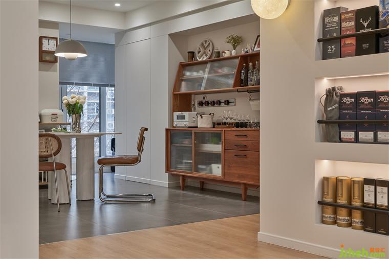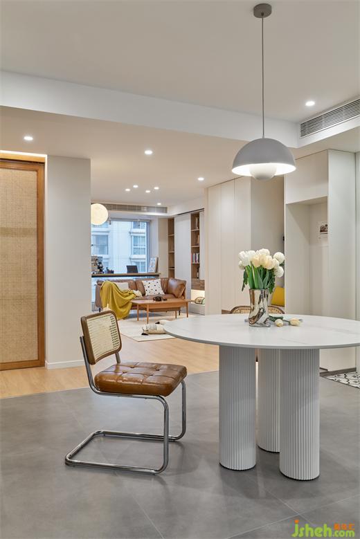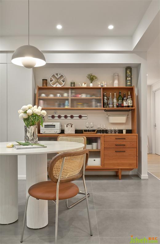 灰調(diào)地磚如同穩(wěn)定的山石,簡明烘托出木元素所含的暖融氣質(zhì),裝修設(shè)計讓穿插其中的波紋玻璃、細膩藤編、清雅金屬釋放出藝境。木色從柜體向餐椅蔓延,并與白色餐桌碰撞出清新之美,桌腿處的條紋,典雅又安然。