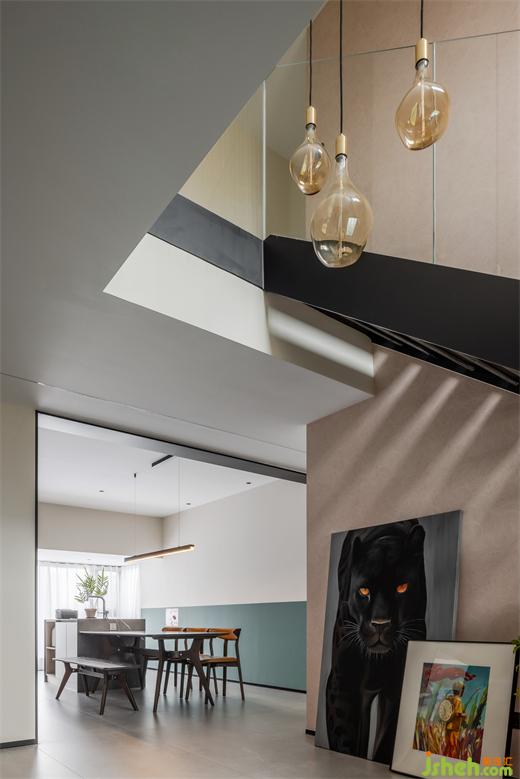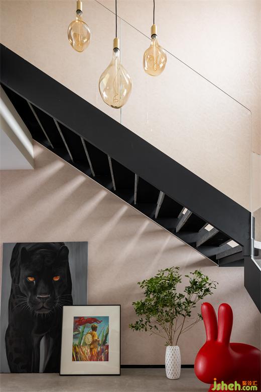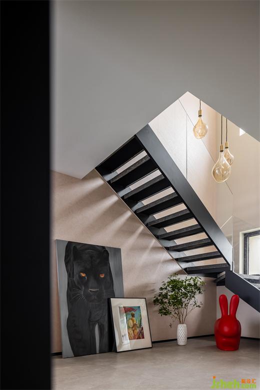 結(jié)構(gòu)折轉(zhuǎn),光影變幻,創(chuàng)造了新鮮有趣的空間互動(dòng),根植藝術(shù)的愉悅性與空間的穩(wěn)定性,以連綿的黑串聯(lián)上下維度。圍欄的剔透扭轉(zhuǎn)了昏暗氣氛,激活了明朗的格調(diào)。