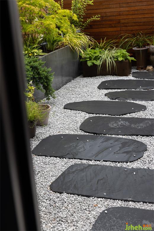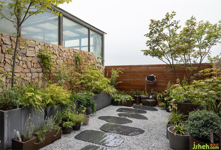 復式裝修設計不規(guī)則的石材裝飾墻擬態(tài)自然之樂,青灰步道深諳枯山水的哲學魅力。綠意從三面而來,高高低低,紛繁多姿,間奏出置身自然山水的暢快情愫。