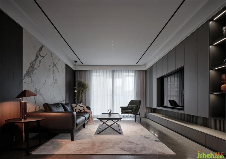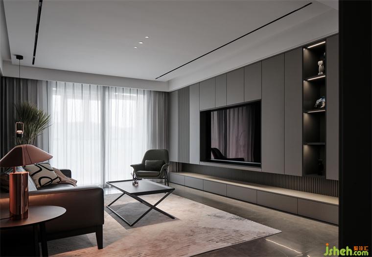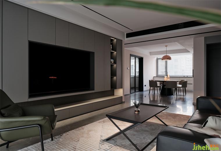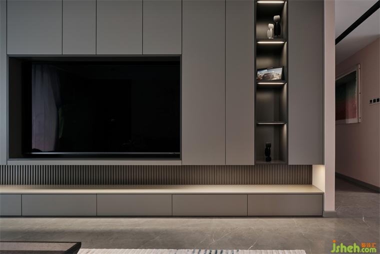 大平層裝修設計利用統(tǒng)一色塊收納儲藏空間,細分從上至下的凹凸比例,糅合均勻的條紋,化解了電視背景墻的沉悶感與壓抑感,衍生出側旁的展示空間,達成一種視覺上的重輕平衡。